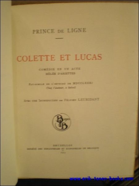 Relie en cuir rouge, plats orne, dos endommage, 15,5x20,5cm, 42pp, illustre, culs-de-lampe. Comedie en un acte melee d' artiste. Avec une introduction par Felicien Leuridant. Fac-simile de l' imprime de 1731, chez l' auteur, a Beloeil. 6 gravures de bois de A. Gardon. Signe par l' editeur. N? 109 de 130 exemplaires numerotes de societaires ou de dedicace sur papier Van Gelder, avec deux etats des portraits.