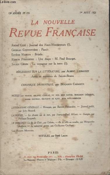 COLLECTION LA NOUVELLE REVUE FRANCAISE N° 155. JOURNAL DES FAUX MONNAYEURS PAR ANDRE GIDE/ PAMIR PAR GEORGES CHENNEVIERE/ BRISEIS PAR EUGENE MARSAN/ UNE ETAPE: M.PAUL BOURGET PAR RAMON FERNANDEZ/ LE VOYAGEUR SUR LA TERRE PAR JULIEN GREEN.