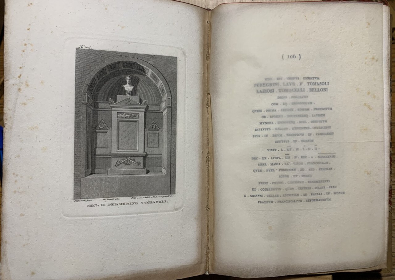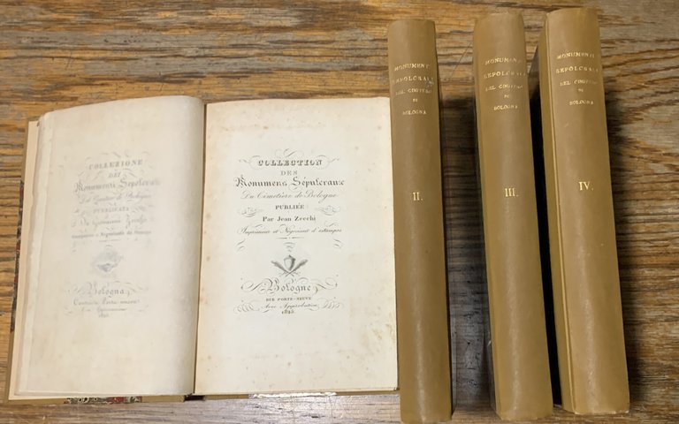 I ed. (1925-7) dell'opera in 4 volumi in-8° piccolo rilegati in mezza tela (dorso ed angoli rifiniti in tela ocra e piatti rifiniti in carta marmorizzata rosso scuro/beige/grigio. Titoli dorati al dorso) e con il taglio superiore delle pagine rosso scuro. Testi in italiano/francese. Incisioni in nero protette da carta velina. " (...) Giovanni Zecchi, negoziante di stampe in Bologna, crede far cosa grata ed utile agli stranieri ed ai nostri collo stampare una collezione de' disegni di tutti i monumenti sepolcrali del Cimitero Comunale incisi in rame a chiaro scuro, e di grandezza tascabile. / Ogni mese sortirà un fascicolo che conterrà quattro disegni, ad ognuno de' quali sarà annessa la iscrizione lapidaria ed una compendiosa memoria del defunto cui il monumento appartiene (...)"/ "(...) Jena Zecchi, merchand d'estampes à Bologne, persuadé de faire une chose agréable et utile aux Etrangers, et surtout aux Bolonais, leur offre une collection des dessins de tous lestombeaux du cimitière, gravés au burin, ombré, d'une dimension portative / Il en sortira tous les mois une livraison qui contiendra quatre dessins, y compris l''inscription lapidaire, et une noctice très succinte sur les personnages morts dont il sera fait mention (...)" (Avvertimento, p. 10/ Avertissement, p. 11). stato dell'opera nel complesso buona (pagine con qualche fioritura). Vol. I, 1925: pp. (12)+tavole 1-40+(46); Vol. II, 1925: pp. (8)+tavole 41-80+(46); Vol. III, 1927: pp. (8)+tavole 81-120+(50); Vol. IV, 1927: pp. (8)+tavole 121-160+(50).