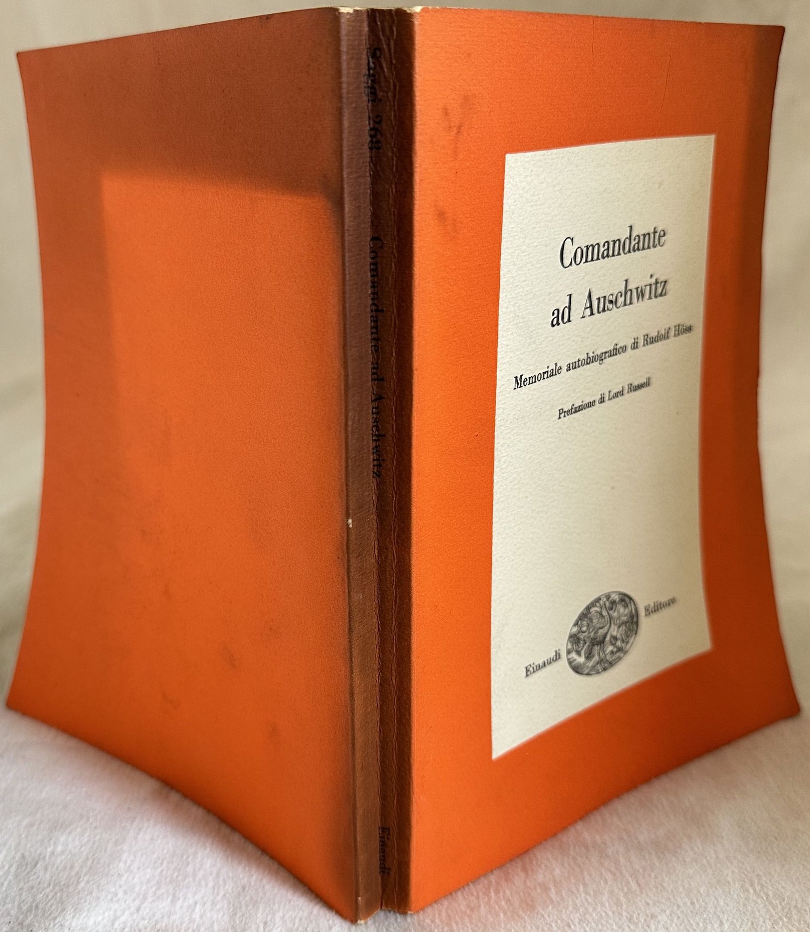 Edizione del 1960 di questo memoriale autobiografico di Rudolf Hoss (1901-1947) Comandante del campo di Concentramento di Auschwitz. Prefazione di Lord Russell. Introduzione di Martin Broszat all'edizione tedesca. Appendice: La soluzione finale della questione ebraica nel campo di Auschwitz; Heinrich Himmler "Reichsfuhrer"; Eichmann "Obersturmbannfuhrer" dele SS e caoi della SezioneEbraica IV B 4 dell'Alto Comando per la sicurezza del Reich. In buone condizioni. Copertina editoriale in ottime condizioni con lievi usure marginali. Legatura in buone condizioni. Pagine in ottime condizioni generali con rare fioriture. Macchie. Sovracoperta mancante. In 8. Dim. 21,5x16 cm. Pp. XLI+228+(12).Edition of 1960 of this autobiographical memory by Rudolf Hoss (1901-1947) Commander of the Field Concentramento in Auschwitz. Prefation by Lord Russell. Introduction by Martin Broszat to german edition. Appendix: La soluzione finale della questione ebraica nel campo di Auschwitz; Heinrich Himmler "Reichsfuhrer"; Eichmann "Obersturmbannfuhrer" dele SS e caoi della SezioneEbraica IV B 4 dell'Alto Comando per la sicurezza del Reich. In good conditions. Editorial cover in very good conditions lightly worn in the extremities. Binding in good conditions. Dustjacket lacks. Pages are in very good conditions with occasional foxing. Stains. In 8. Dim. 21,5x16 cm. Pp. XLI+228+(12).