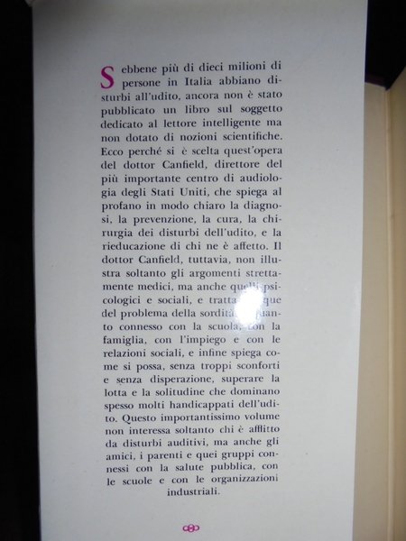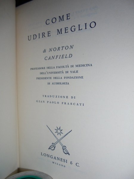 CANFIELD professore della facoltà di medicina dell' Università di Yale presidente della fondazione di audiologia. Traduzione di Gian Paolo Frascati - Milano, Longanesi & C., 1968. In-16°, tela con tassello e titolo in oro sul dorso e sovracopertina. 308, (17) pp. di pubblicità editoriale. In ottimo stato di conservazione. Neg. mob. nero