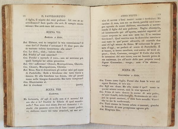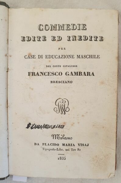 Edizione del 1835 di questa raccolta di commedie ad uso delle case di educazione maschile scritte da Francesco Gambara da Brescia (Monticelli d'Ongina (Piacenza) 1771- Brescia 1848). Gambara fu segretamente filo francese e tra i promotori della Rivoluzione bresciana del 1797. Fu attivo nella lotta politica e si distinse anche in ambito letterario. All'interno: L'illustre incognito, Il ravvedimento, Il trinfo dell'innocenza, La generosità fraterna. Antiche note manoscritte. In buone condizioni e completo. Copertina cartonata in discrete condizioni generali con lievi usure ai margini e dorso. Legatura in buone condizioni. All'interno le pagine si presentano in buone condizioni con fioriture. In 16. Dim. 16x11 cm. Pp. 186+(3). Edition of 1835 of this collection of plays for the usage of male schools written by Francesco Gambara da Brescia (Monticelli d'Ongina (Piacenza) 1771- Brescia 1848). Gambara was in agreement with France and promoter of Brescia Revolution of 1797. He was active in political fight and distinguished in litterary field. Inside: L'illustre incognito, Il ravvedimento, Il trinfo dell'innocenza, La generosità fraterna. Antique handwritten notes. In good conditions and complete. Copertina icartonata in discrete condizioni generali con lievi usure ai margini e dorso. Legatura in buone condizioni. All'interno le pagine si presentano in buone condizioni con fioriture. In 16. Dim. 16x11 cm. Pp. 186+(3). In good conditions and complete. Carton cover in fair general conditions lightly worn in the extremities. Binding in good conditions. Pages in good conditions with foxing. In 16. Dim. 16x11 cm. Pp. 186+(3).