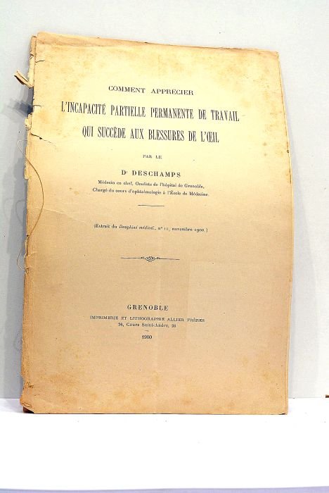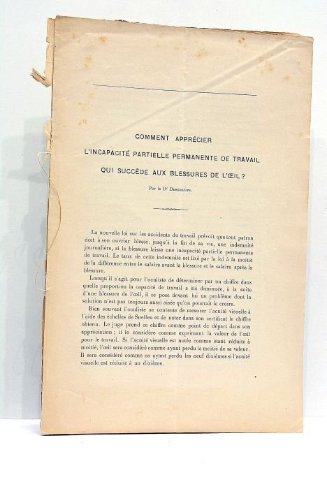 in-8. 8pp. Feuillets déreliés. Petites déchirures dans les marges des 1er et derniers feuillets. Rousseurs éparses. Traces de plis. Intéressante petite étude sur les rapports entre la législation du travail et les accidents ayant produit des perturbations de la vision ("Changements dans la Réfraction", "Vision binoculaire", etc). Tiré à part du Dauphiné Médical. Ophtalmologie. Optique.