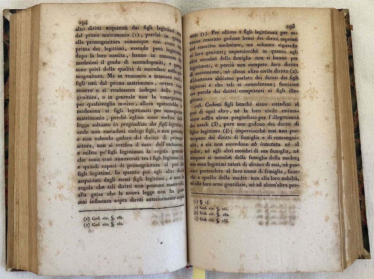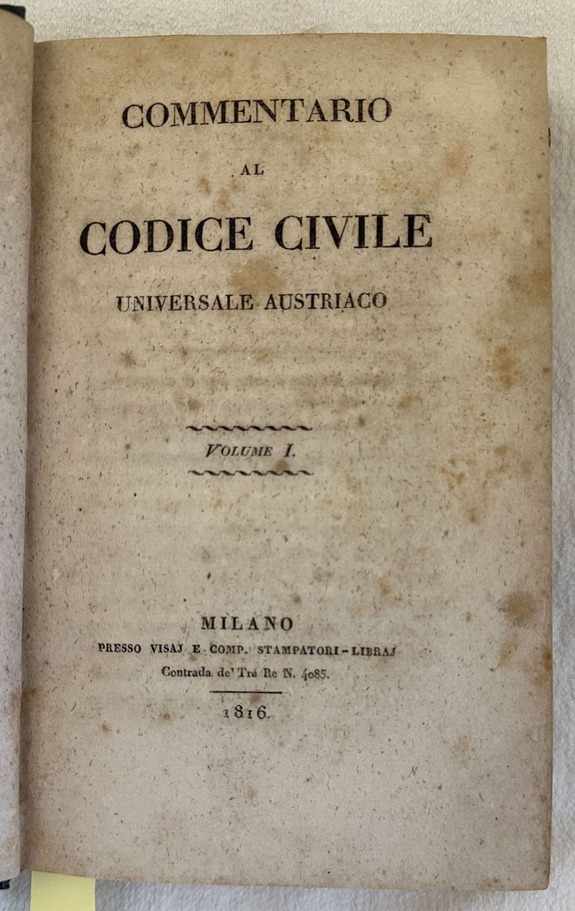 Edizione del 1816 di questo commentario al Codice austriaco a cura di Onofrio Taglioni. Il codice austriaco venne promulgato dall'Imperatore Francesco I nel 1811 ed entrato in vigore l'anno successivo. L'opera era composta da otto volumi, siamo in possesso dei primi due tomi legati insieme in un unico volume. In buone condizioni. Copertina in mezza tela con titolo e decorazioni in oro al dorso in buone condizioni con lievi usure marginali. Legatura in buone condizioni. Pagine in buone condizioni con fioriture. In 8. 20,5x13 cm. Pp. XI+244+252. Edition of 1816 of this commentary to the Austrian code by Onofrio Taglioni. The code was promulgated by the Emperor Francesco I in 1811 and became active the year after. The work was made up of eight volumes, we only have two tomes bound together in a unique volume. In good conditions. Half cloth cover with gilted title and decorations in the spine in good conditions lightly worn in the extremities. Binding in good conditions. Inside pages are in good conditions with foxing. In 8. 20,5x13 cm. Pp. XI+244+252.