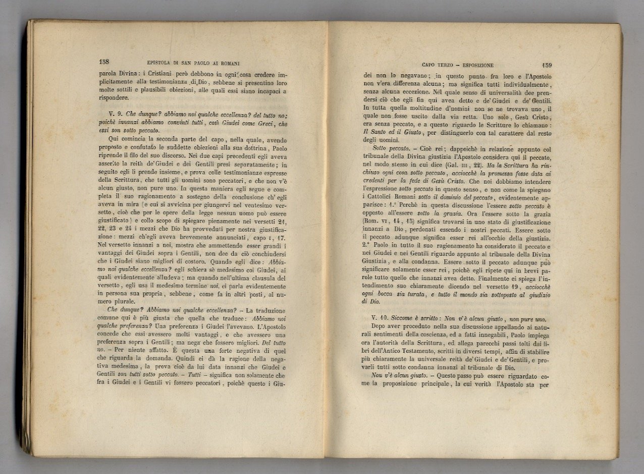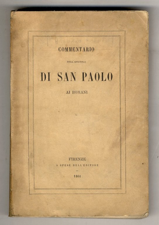 Firenze, a spese dell'Editore (Tipografia Galileiana: come si evince da timbro al foglio di guardia posteriore), 1861, in-8, br. editoriale, pp. 408. Minime mancanze al dorso. Si tratta del solo volume 1° (il 2° è del 1863) di questa opera del teologo scozzese, che dopo la conversione alla chiesa evangelica, dedicò la propria vita, fortuna economica ed opera al missionariato ed alla divulgazione, fondando ad Edinburgo la "Society for Propagating the Gospel at Home".