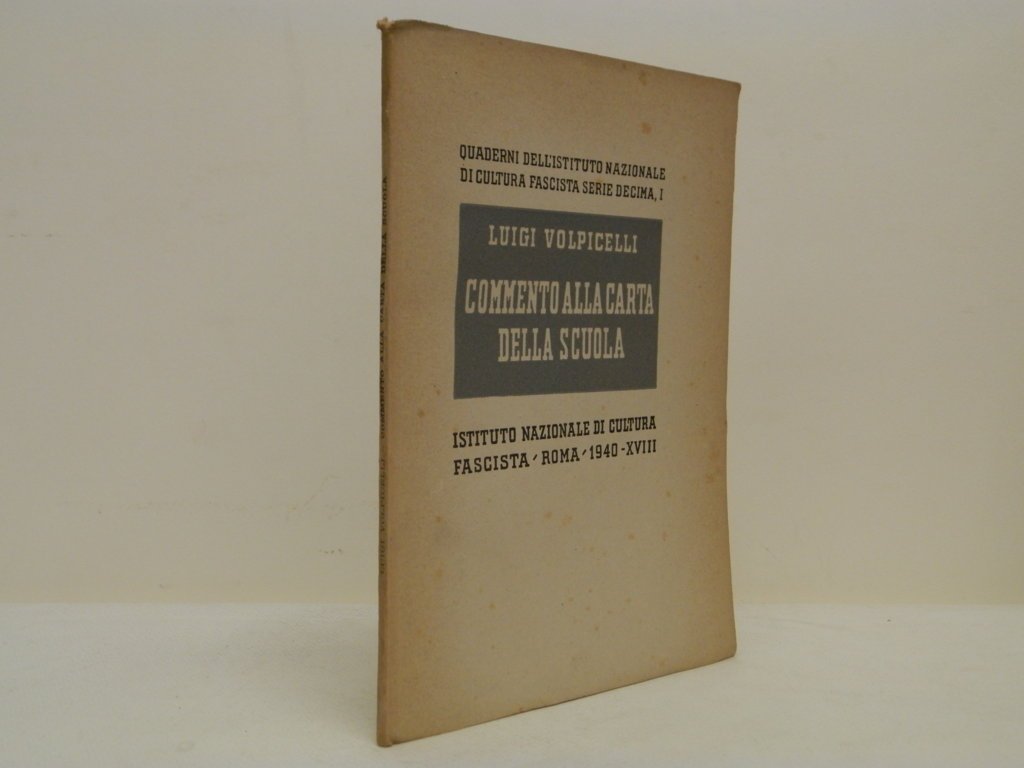 8^, mm 225x165, pp. 45, (1), brossura editoriale, ottimo stato di conservazione, lievissima fioritura al piatto, dorso lievemente ingiallito, ex libris applicato al contropiatto, pagine chiuse. Indice: «La scuola pubblica e la scuola privata; Le scuole religiose; Le scuole laiche; La scuola e la società; La carriera dei giovani; I collegi di Stato; Discipline e orientamenti nuovi; La legge Casati e il rinnovamento culturale in Italia; Sviluppi e riflessi dell'insegnamento delle lingue nelle scuole superiori; Sviluppi e riflessi dell'insegnamento linguistico nelle scuole classiche; Le lingue nelle scuole tecniche; Le lingue nella scuola normale; Dalla legge Casati alla riforma del '23; Il lavoro; Il lavoro come cultura formale; Lavoro e cultura; Verso un nuovo umanesimo; La Carta della scuola e la riforma del '23; Il lavoro nella Carta della scuola; Uomini e libri». - L'autore (1900-1983), discepolo di Giovanni Gentile, fu un noto pedagogista, molto attivo anche nel secondo dopoguerra. facente parte della serie "Quaderni dell'istituto nazionale di cultura fascista serie decima, I" prima edizione.. *** TUTTI I NOSTRI LIBRI SONO VISIBILI PREVIO CONTATTO MAIL O TELEFONO NELLA NUOVA SEDE DI MILANO: LIBRERIA COSMOPOLIS, VIA JOMMELLI, 22. ***
