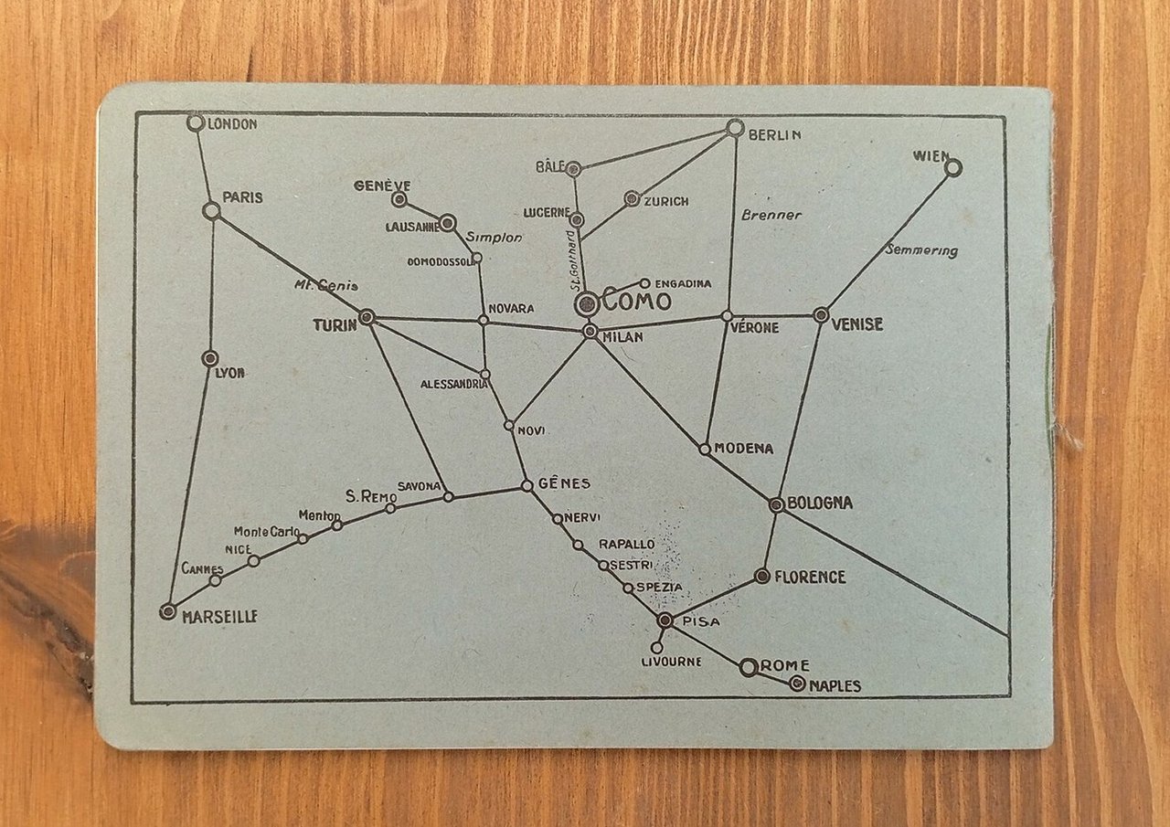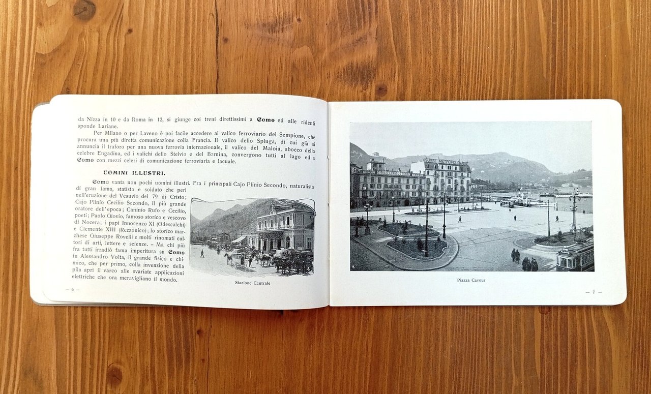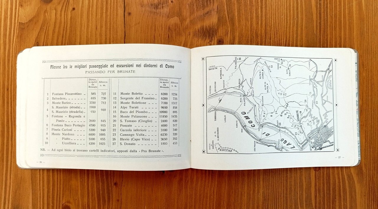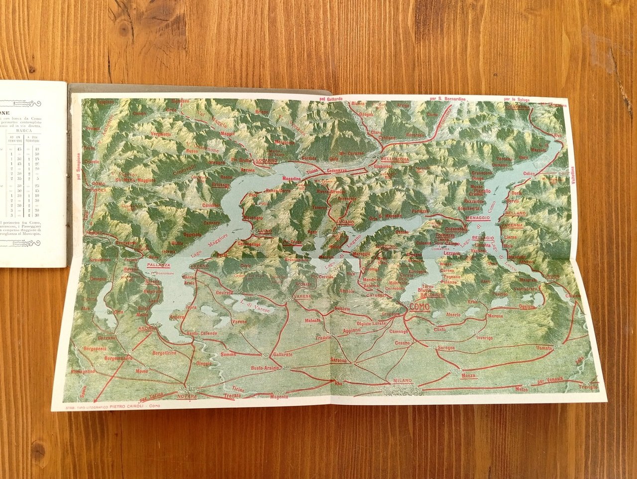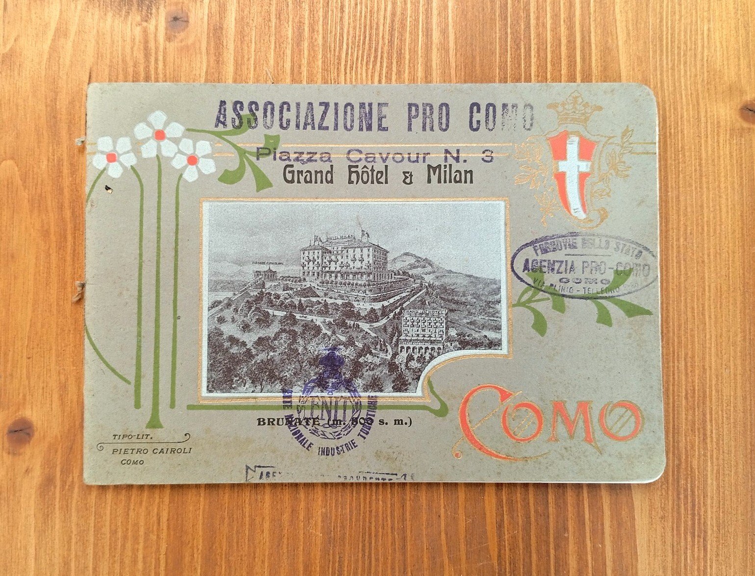 Brossura originale in formato album (16,5 x 11,5 cm), legatura a filo, tavolina illustrata al piatto con titoli e decorazioni in stile Liberty, 48 pagine con illustrazioni in bianco e nero tratte da fotografie dello Stabilimento eliografico Brunner & C. di Como; 1 tavola ripiegata in apertura raffigurante il Panorama delle Alpi da Brunate; 1 grande carta geografica a colori più volte ripiegata in chiusura, al retro della quale vi è un'ulteriore pianta della città di Como con indicazioni utili; carta topografica stampata al retro della brossura; nel testo sono presenti descrizioni delle località, itinerari consigliati e tariffari per i servizi alberghieri e per il trasporto in barca. Timbri di associazioni pro-loco comensi e dell'ENIT al piatto, peraltro esemplare ottimamente conservato di una graziosa, esaustiva, nonché assai rara guida del primo Novecento.