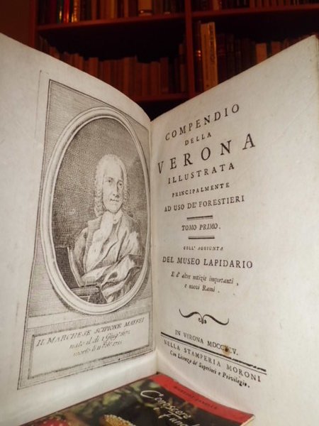 Maffei, Scipione. Verona, Stamperia Moroni, 1795. Compendio della Verona illustrata principalmente ad uso de' forestieri. Coll' aggiunta del Museo Lapidario e d' altre notizie importanti,e nuovi rami. 2 volumi in - 8°, m. pelle coeva. (4), 239, (1) pp. con ritratto e 14 tavole incise in rame f.t.; (4), 206, (2) pp. e 18 tavole ripiegate f.t. Bell' esemplare. Lozzi, 6300 (per l' edizione originale). Uff. Mob. 1