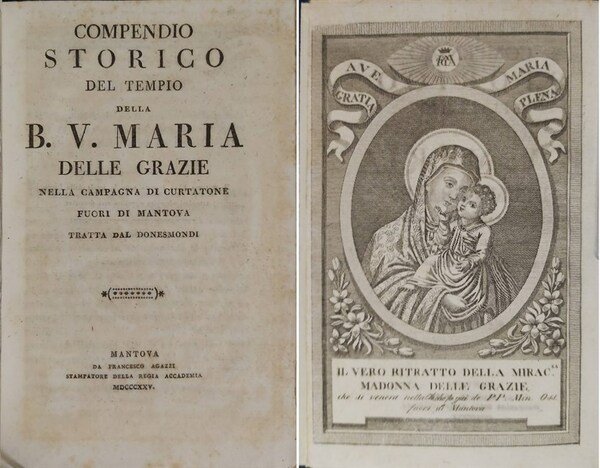 in-8, pp. 46, 1 cb, rileg. mod. t. tela con tass. in pelle al piatto ant. con tit. oro. Antip. con belliss. inc. in rame del dipinto della Vergine delle Grazie, conservato nel noto santuario mariano nei pressi di Mantova. E' il testo pubblicato nell'Istoria Ecclesiastica di Mantova dal Donesmondi nel 1610-15, riproposto dal Bottoni. Interess. per la descrizione delle famose statue. Prima edizione, la seconda fu pubblicata nel 1833. Raro. Ciaramelli-Guerra, p.71. Ottimo esempl. [177]
