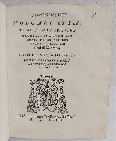 COMPONIMENTI VOLGARI ET LATINI di diversi et eccellenti autori in morte di Monsignore Hercole Gonzaga cardinal di Mantova, con la Vita del medesimo descritta dall'Asciutto Academico Invaghito.