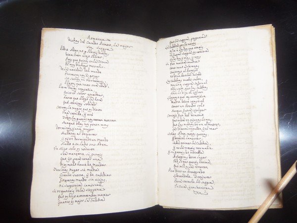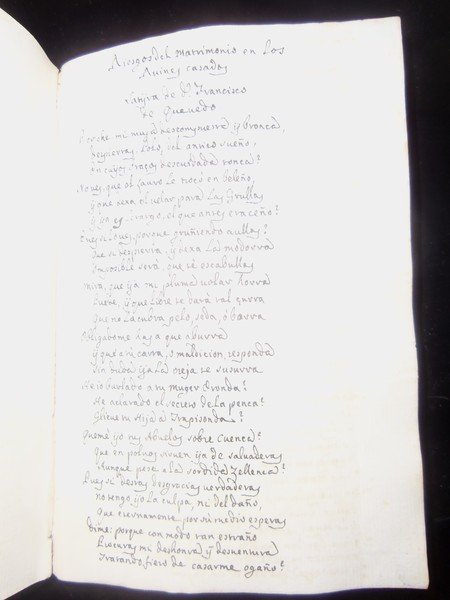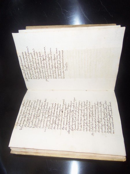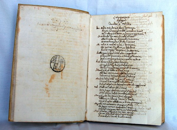 [Manoscritto- Spagna Italia](cm. 20x13,5) Bella piena pergamena originale, titolo manoscritto al dorso. manoscritto del XVII secolo, di unica mano in italiano e spagnolo, composto di 202 pagine, vergate in bella e chiara grafia. L'opera contiene 43 composizioni poetiche, satiriche e galanti per lo pi˘ inedite. Quattro sono di G.B. Ricciardi, due del Berneri, e una dello Zappi, come leggesi in fine a ciascuna. Il Ricciardi fiorentino, insegnÚ a Pisa, pubblicÚ varie opere. Per notizie biografiche, vedi: Inghirami "storia toscana" 1843, III p. 175 e Negri "scrittori fiorentini" 1722 p. 250. Il Berneri G., romano, pubblicÚ varie opere anche in dialetto. In particolare il "Meo patacca" in una strana mescolanza linguistica con il romanesco. Per notizie biografiche vedi: Amati "Bibliografia romana", p. 34 e Mazzucchelli "scrittori d'Italia" 1753, II p. 999. Lo zappi G.B. Felice da Imola (1667-1719) fu pastore arcade. Per notizie biografiche vedi: Angeli " Illustri imolesi" 1828, p. 115; Papotti "illustri imolesi" 1841, p. 185; Giorgetti Vichi "arcadi dal 190 al 1800" 1977. p. 253. Le altre composizioni anonime sono di vario e curioso genere: la cometa, il ganimede, aborto, contro le donne, le mammelle, tormenti amorosi, l'orologio a polvere ecc.Seguono altre 38 composizioni satiriche e burlesche in spagnolo, alcune di Francisco De Quenedo e di vario genere in 72 pagine. Il tutto in eccellente conservazione. Antico ex-libris nobiliare, manoscritto e timbro alla prima carta con stemma.[f70]