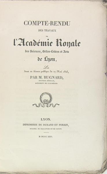 Lyon, imprimerie de Durand et Perrin, 1825. Plaquette in/8 en couverture d’attente, 36 p. Feuillets en très bon état. Séance publique du 27 mai 1825