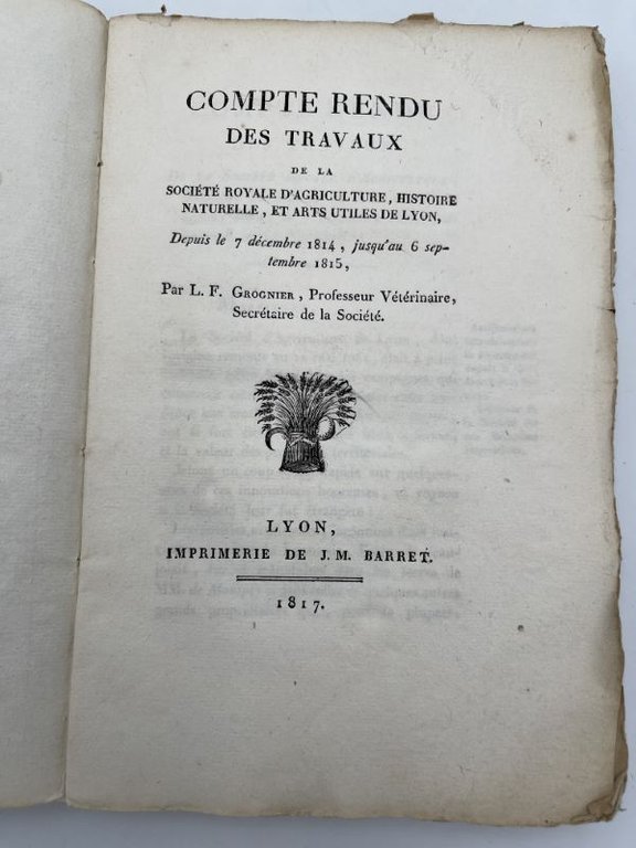 Compte rendu des travaux de la société royale d'agriculture , histoire naturelle, et arts utiles de Lyon depuis le 7 décembre 1814, jusqu'au 6 septembre 1815