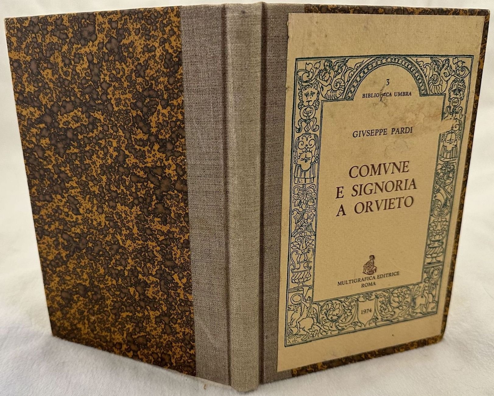 Edizione del 1974 di questa monografia sul comune e signoria a Orvieto di Giuseppe Pardi. Volume della collana "Biblioteca Umbra n. 3". Ristampa anastatica dell'edizione originale Atanor, Città di Castello 1916. In ottime condizioni. Copertina cartonata editoriale in buone condizioni generali con lievi usure ai margini e dorso. Legatura in ottime condizioni. All'interno le pagine si presentano in ottime condizioni con rare fioriture. In 8. Dim. 19,5x14 cm. Pp. 123+(3). Edition of 1974 of this monography about the comune and signoria in Orvieto by Giuseppe Pardi. Volume of the series "Biblioteca Umbra n. 3". Anastatic republishing of the series Atanor, Città di Castello 1916. In very good conditions. Carton editorial cover in good general conditions lightly worn in the extremities. Binding in very good conditions. Inside pages are in very good conditions with occasional foxings. In 8. Dim. 19,5x14 cm. Pp. 123+(3). <BR><BR>