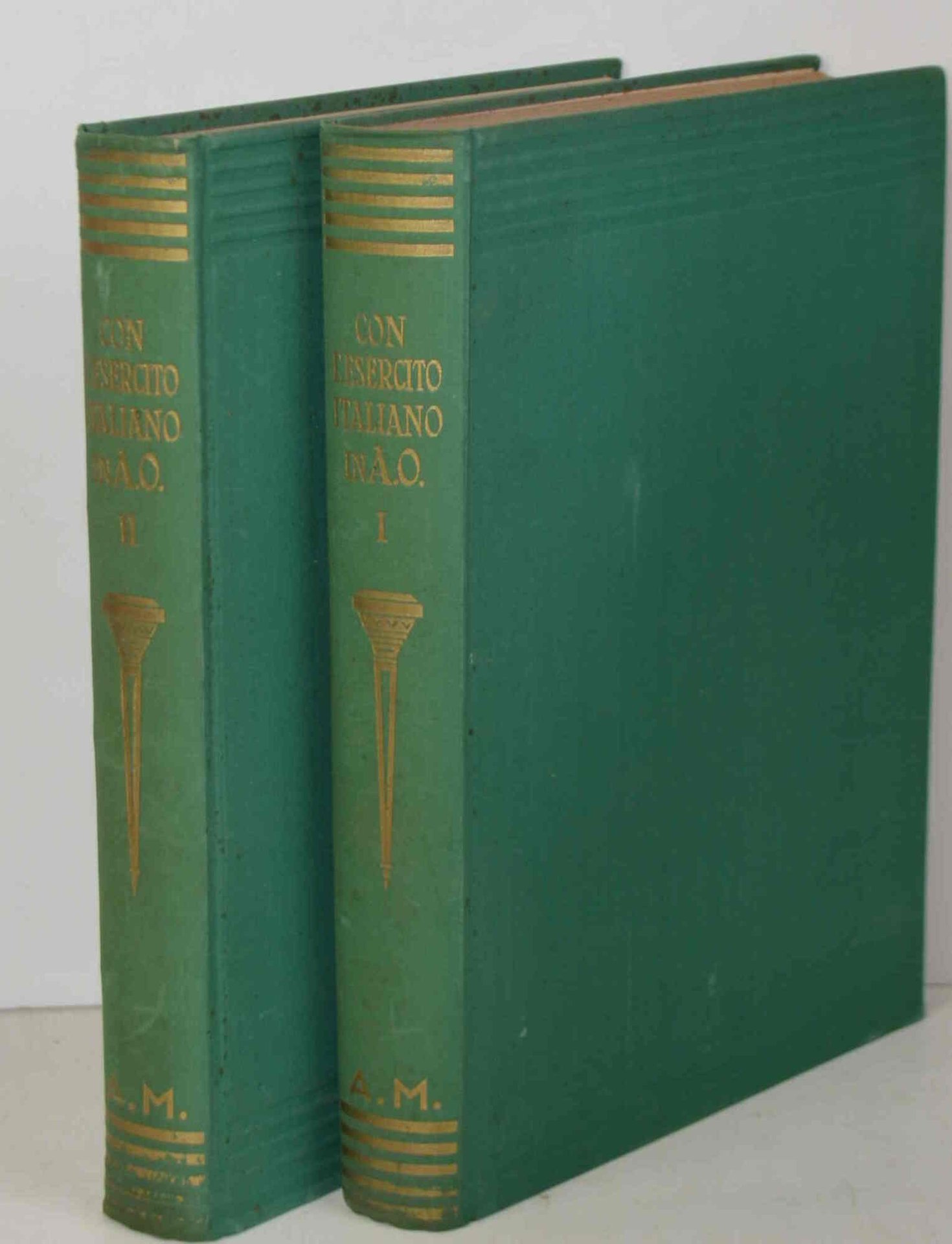 Due volumi di cm. 26, pp. (8) 798 (2) complessive. Con moltissime illustrazioni, carte e tavole ripiegate f.t. Leg. edit. in tela verde con titoli in oro. Firma di possesso ai frontespizi. Buona conservazione. Celebre opera che documenta dal punto di vista storico ed iconografico la presenza italiana nell'Africa Orientale.