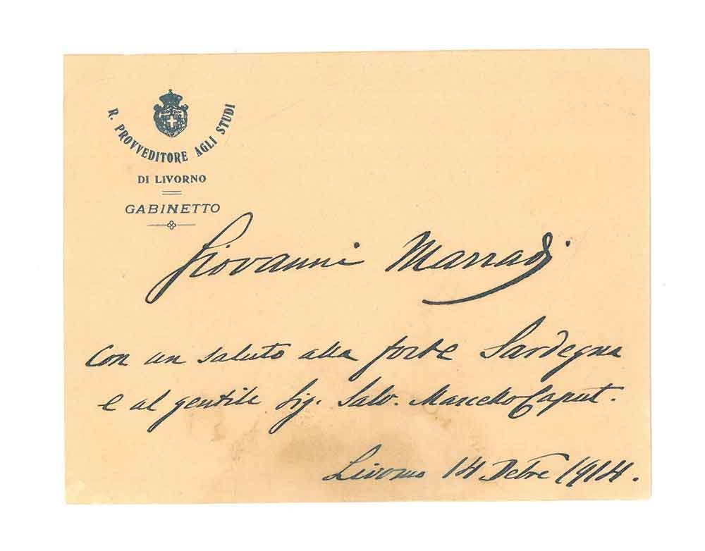 "Con un saluto alla forte Sardegna e al gentile Sig. Salv. Marcello Caputi. Livorno 14 Sett 1814". Autografo