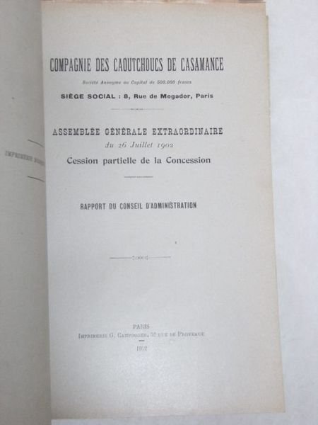 in-8. XI. 141pp. Broché, couverture imprimée protégée par du papier cristal. Les 2 derniers ouvrages se dérelient légèrement. Première édition illustrée d'1 carte. Envoi autographe de l'auteur. On y a joint: 2). COMPAGNIE des Caoutchoucs de Casamance… Rapport du Conseil d'Administration. Paris, 1902. in-8. 16pp. Broché, couverture imprimée 3). RESILIATION de la Concession de Casamance. S.l.n.d. (Février, 1904). in-8. 8pp. (Tiré-à-part du "Journal Officiel). Intéressant ensemble.