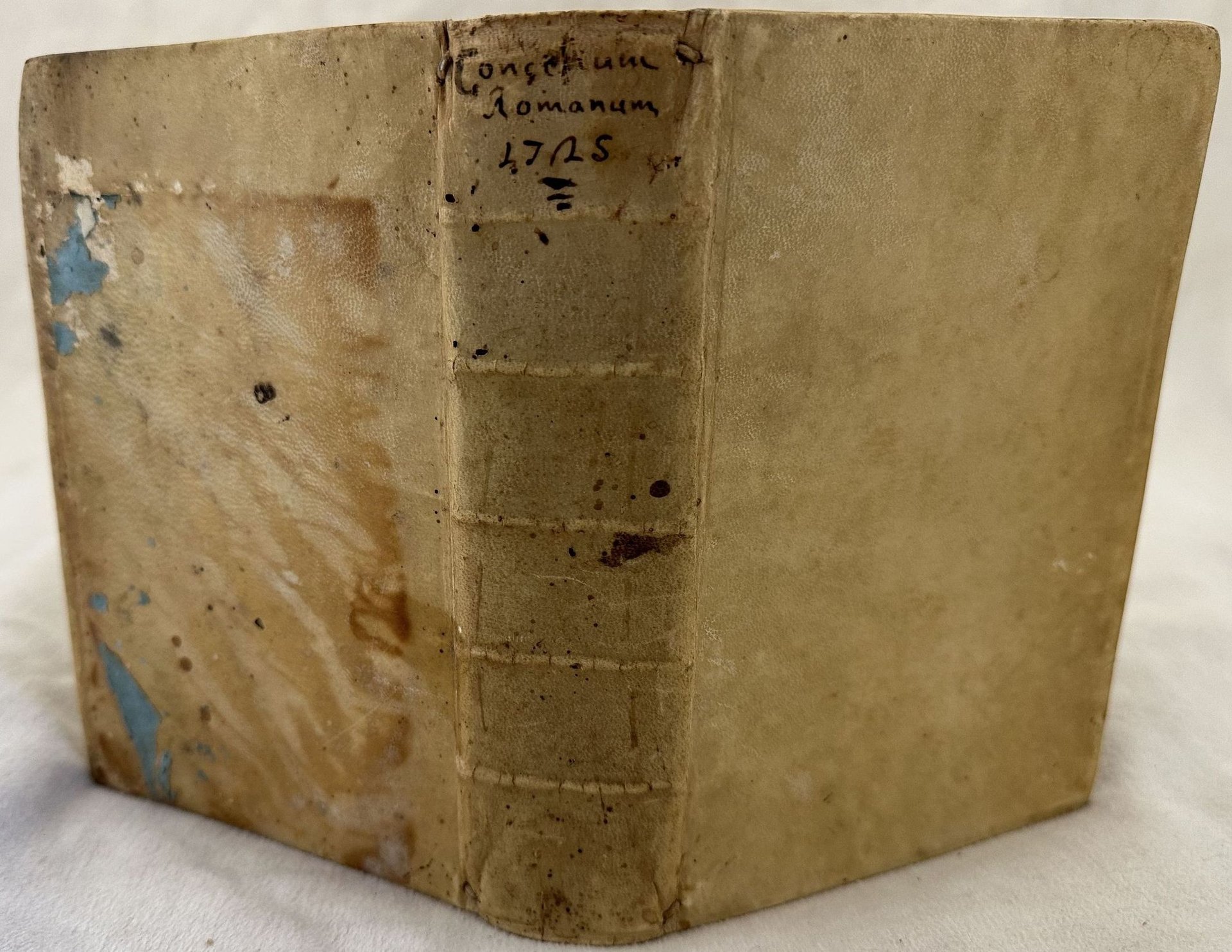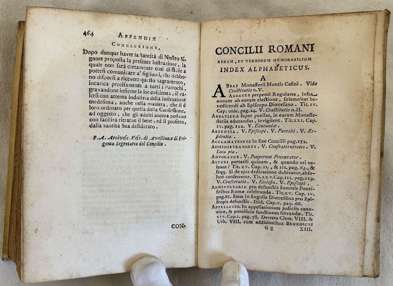 Interessante opera sul Concilio Romano avvenuto nell'anno di Giubileo 1725 nella Basilica di San Giovanni in Laterano a Roma ad opera di Papa Benedetto XIII. All'interno: Titoli, Decreti, Appendici (Constitutiones). Testo talvolta in latino, o in italiano. In discrete condizioni. Copertina in piena pergamena con titolo manoscritto al dorso in ottime condizioni generali con lievi usure ai margini e dorso. Resti di carta in copertina.Legatura in buone condizioni ma corpo del libro quasi del tutto staccato. All'interno le pagine si presentano in buone condizioni con fioriture. In 16. cm 18,5x12,5. Pp. (18)+464+(22).Interesting work about roman Council during the year of jubilee 1725 held in the Basilica of San Giovanni in Laterano in Rome by the Pope Benedetto XIII. Inside: Titles, Decrees, Appendix (Constitutiones). Test in latin or italian. In fair conditions Full parchment cover with handwritten title in the spine in very good general conditions lightly worn in the extremities. Signs of paper in the cover. Binding in good conditions but the body of the book almost totally detached. Inside pages are in good conditions with foxing. In 16. cm 18,5x12,5. Pp. (18)+464+(22).