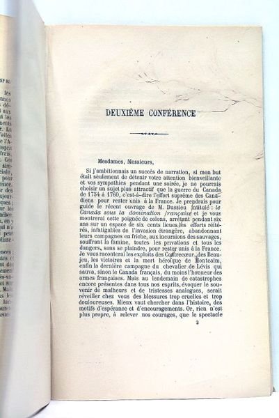 In-8. 60pp. Broché. Petites taches marrons sur l'ensemble des feuillets. Minimes déchirures dans la marge des 2 derniers feuillets. Conférences sur le Canada contenant notamment des considérations sur l'histoire, la littérature et la géographie du pays, la physionomie des Canadiens, le Québec, la chasse, etc. America.