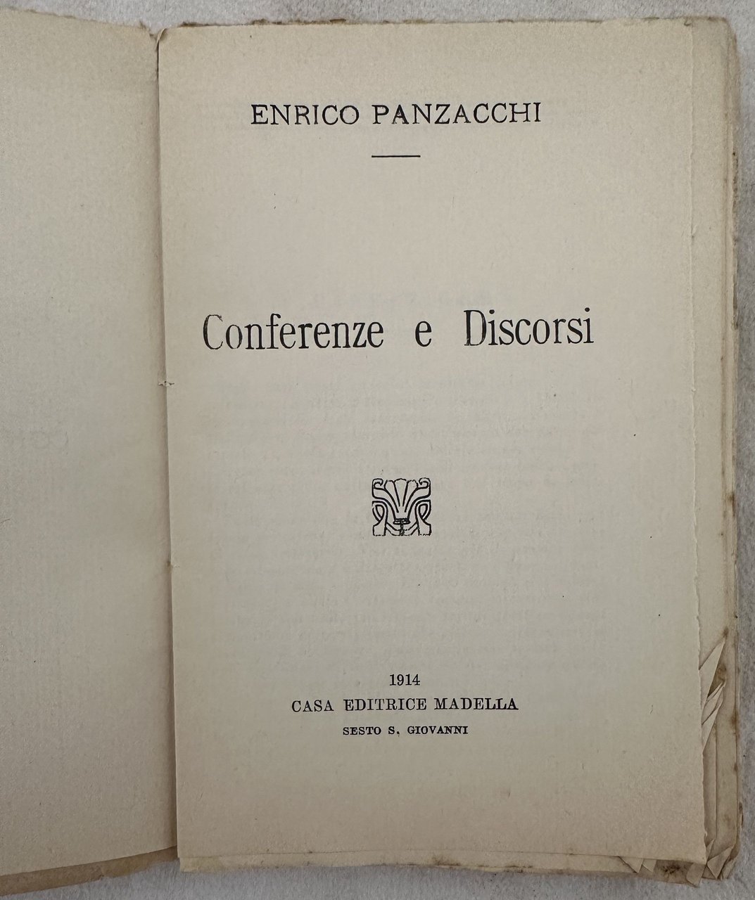 Edizione del 1914 di questa raccolta di conferenze e discorsi del poeta, critico d'arte e critico musicale Enrico Panzacchi (1840-1904) nato a Ozzano dell'Emilia. Panzacchi fu professore di storia al Liceo Azuni di Sassari. All'interno: Giacomo Leopardi, Centenario di Rossini, Il Guercino e il seicento nell'arte, Le origini dell'arte nuova, Leonardo da Vinci, Raffaello Sanzio, Una lotta musicale, Giambattista Marini, Vittorio Alfieri, L'Arte romana, La difesa del Vascello, Per il pittore Luigi Serra, Alla "Dante Alighieri".<BR>Copertina editoriale in buone condizioni generali con lievi usure ai margini e dorso. Legatura in buone condizioni. All'interno le pagine si presentano in buone condizioni con fioriture. In 8. Dim. 19x12,5 cm. Pp. 236+(1).Edition of 1914 of this collection of conferences and speeches by the poet, art critic and musical critic Enrico Panzacchi (1840-1904) born in Ozzano dell'Emilia. Panzacchi was teacher of history in Secondary School Azuni in Sassari.<BR>The work is made up of inedit lyrics or lyrics appeared singularly on magazines and pamphlets.<BR>inside: Giacomo Leopardi, Centenario di Rossini, Il Guercino e il seicento nell'arte, Le origini dell'arte nuova, Leonardo da Vinci, Raffaello Sanzio, Una lotta musicale, Giambattista Marini, Vittorio Alfieri, L'Arte romana, La difesa del Vascello, Per il pittore Luigi Serra, Alla "Dante Alighieri".<BR>Editorial cover in good general conditions lightly worn in the extremities. Binding in good conditions. Inside pages are in good conditions with foxing. In 8. Dim. 19x12,5 cm. Pp. 236+(1).