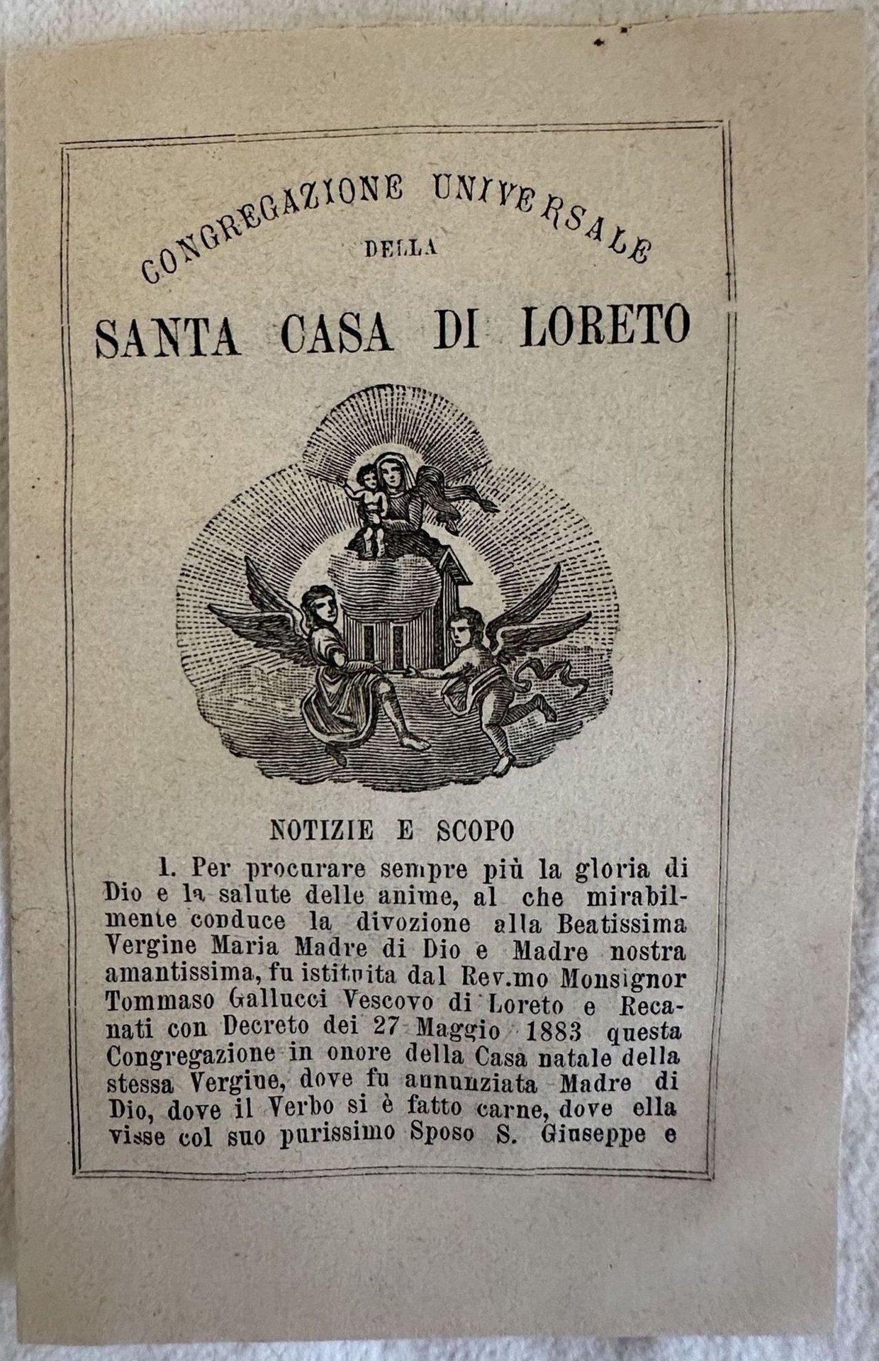 Rara tessera del 1885 della "Congregazione universale della Santa Casa di Loreto" associazione istituita nel maggio 1883 da Monsignor Tommaso Gallucci Vescovo di Loreto e Recanati. La tessera è stata rilasciata dalla Parrocchia di Castel Rigone. Nel volantino viene indicato lo scopo dell'associazione, le pratiche, i favori spirituali. Nell'ultima pagina nome dell'associata, importo dell'offerta e timbro dell'Associazione. In 24. 14x9 cm Pp. (4)Scarce card of 1885 of the "Congregazione universale della Santa Casa di Loreto" association instituted in may 1883 by Monsignor Tommaso Gallucci Byshop of Loreto and Recanati. The card has been released by the Parrocchia of Castel Rigone. In the pamphlet there is the aim of the association, practices, spiritual favours. In the last page the name of the associated person, amount of the offer and stamp of the association. In 24. 14x9 cm Pp. (4)