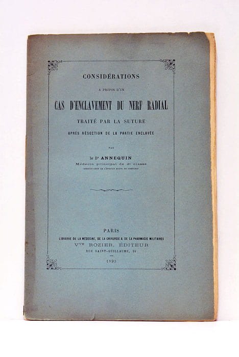 24 pages. (25x16,5cm). Broché. Couverture imprimée légèrement brunie avec petites déchirures marginales. Petites rousseurs éparses. Dos frottée. Coins émoussés. Publié à Paris en 1893, cet ouvrage du Dr Annequin se focalise sur un cas médical spécifique : l'enclavement du nerf radial. À travers l'étude de ce cas, où il a procédé à la résection de la partie enclavée suivie d'une suture, le docteur apporte une contribution notable à la chirurgie nerveuse de la fin du XIXe siècle. Le travail du Dr Annequin s'inscrit dans cette dynamique d'innovation, offrant un éclairage sur les pratiques et les réflexions médicales de son époque, tout en posant les bases de techniques qui continueront à évoluer. Papier légèrement bruni avec taches et rousseurs éprases. Exemplaire partiallement non coupé.
