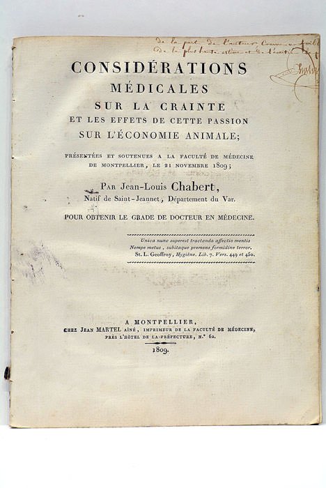 Considérations Médicales sur la Crainte et les Effets de cette Passion sur l'Économie Animale; présentés et soutenues à la Faculté de médecin de Montpellier, le 21 novembre 1809.