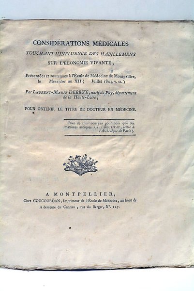 Considérations médicales touchant l'influence des habillemens sur l'économie vivante, présentées et soutenues à l'École de Médecine de Montpellier, le _ Messidor an XII (_ juillet 1804 v. st) pour obtenir le titre de Docteur en Médecine.