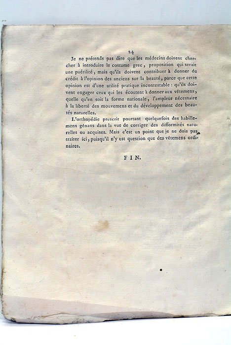 24 pages. (27x21,5 Cm). Broché. 1er cahier derelié. TachesTaches et rousseurs. Petit trou de vers traversant la totalité du document touchant quelques lettres. Curieux thèse sur l'influence des habillements sur l'ètre humain. On peut lire entre autre: " Les habillemens doivent avoir une forme qui ne contrarie pas la beauté du corps, et qui puisse mème servir à la développer. Heureux les peuples qui n'ont pas sur la beauté des idées bizarres et qui savent trouver la perfection dans le rapport des formes aux usages !". Exemplaire non-coupée.