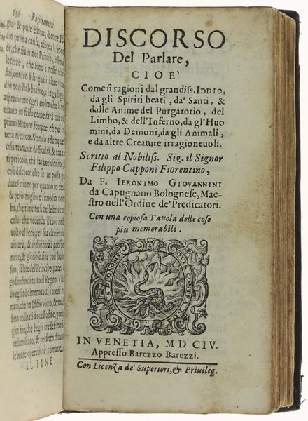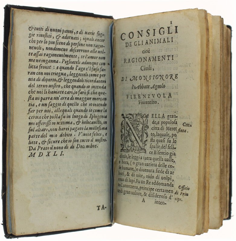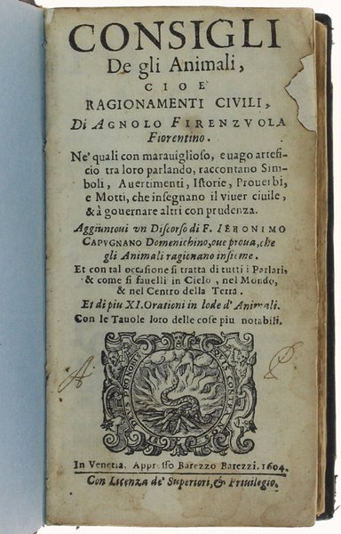 CONSIGLI DE GLI ANIMALI CIOE' RAGIONAMENTI CIVILI + DISCORSO DEL PARLARE + DILETTEVOLI ORATIONI NELLA MORTE DI DIVERSI ANIMALI | Libri antichi e moderni | Firenzuola Agnolo + Capponi Filippo + (Lando Ortensio)