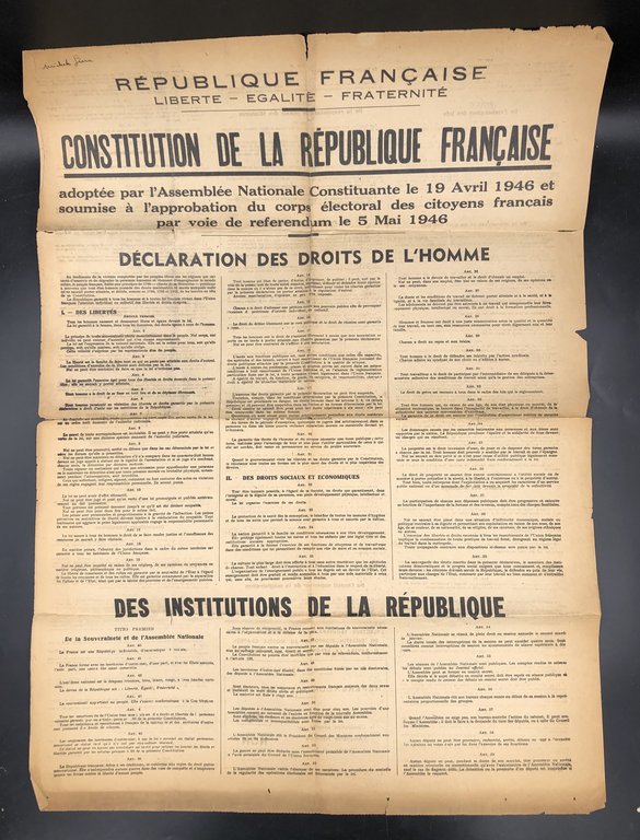 CONSTITUTION de la REPUBLIQUE Française adoptée le 19 Avril 1946. soumise à l'approbation . des citoyens par voie de référendum 5 Mai 1946 - DECLARATION des DROITS de l'HOMME, INSTITUTIONS.