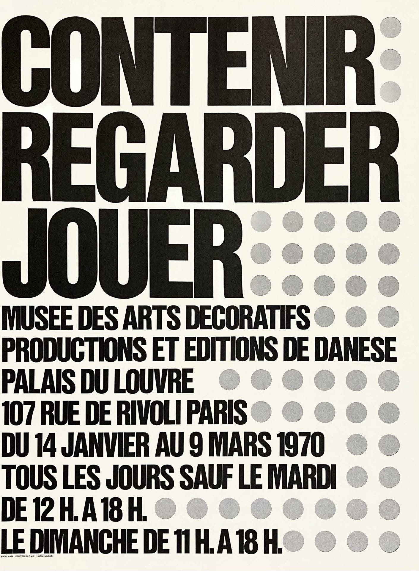 Manifesto con fori fustellati, stampato in occasione della mostra prodotta da Danese Milano e tenutasi a Parigi presso il Musée des Arts décoratifs dal 14 gennaio al 9 marzo 1970. In ottimo stato.