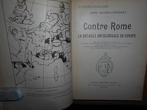 John Grand-Carteret. Paris, Louis Michaud éditeurs, s.d. c. 1930. Contre Rome la Bataille Anticléricale en Europe. In-16°, tela con fregi e titolo in oro al dorso, copertine originali conservate. 318 pp. con numerose illustrazioni in bianco e nero nel testo. In ottimo stato di conservazione. Neg. mens. bianca cassa
