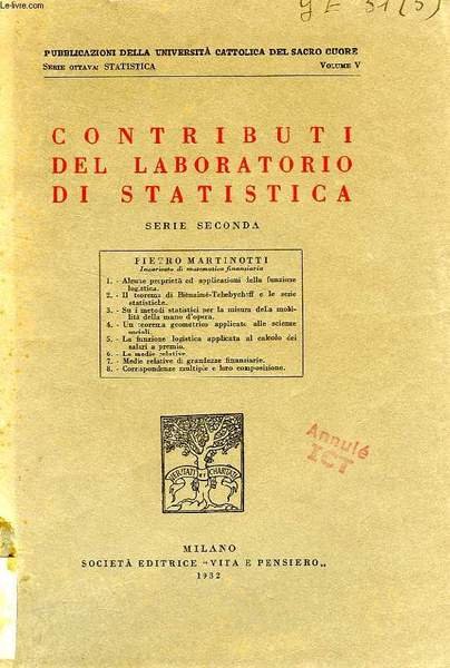 Vita e Pensiero. 1932. In-8 Carré. Broché. Etat d'usage. Couv. légèrement passée. Dos abîmé. Non coupé. 145 pages. Etiquette de code sur le dos. Tampons et annotation de bibliothèque sur le 1er plat et en page de titre. Pubblicazioni della Università Cattolica del Sacro Cuore, Serie Ottava: Statistica, Vol. V. Pietro martinotti, Incaricato di Matematica Finanziaria. Alcune proprietà ed applicazioni della funzione logistica. Une teorema geometrico applicato alle scienze sociali.