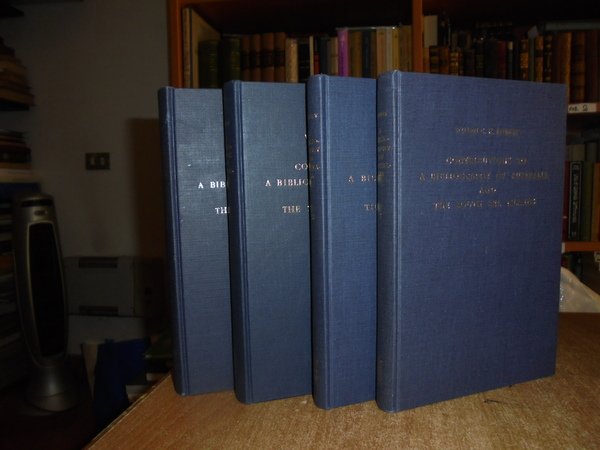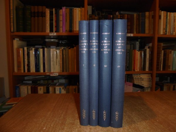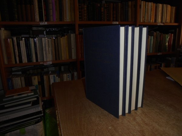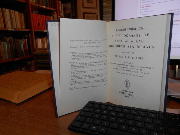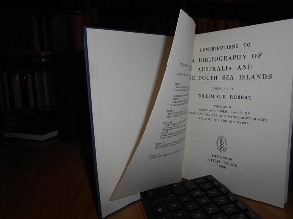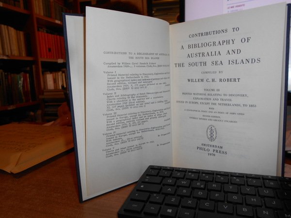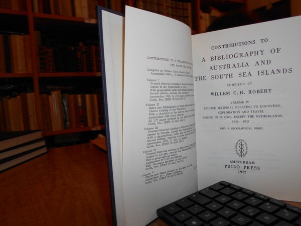 WILLEM C. H. ROBERT. Amsterdam, Philo Press, 1969 - 68 - 70 - 72. Contributions to a Bibliography of Australia and south sea Islands. 4 volumi in-8°, tela edit. bleu con titoli in oro sui piani e ai dorsi. Vol. I. Printed material relating to discovery, exploration and travel issued in the Netherlands to 1921 second edition, revised and enlarged. x, 275 pp.; Vol. II. Index and Bibliography of dutch manuscripts and manuscript-charts relating to the discovery. xi, 227 pp. con in fine una grande carta più volte ripiegata.; Vol. III. Printed material relating to discovery, exploration and travel issued in Europe, except the Netherlands, to 1853 with a gepgraphical index and an index of ships cited second edition, entirely revised greatly enlarged. x, 401 pp. con due riproduzioni in fine.; Vol. IV. Printed material relating to discovery, exploration and travel issued in Europe, except the Netherlands, 1836 - 1921 with a geographical index. xiii, 382 pp. con tre riproduzioni in fine. Esemplare come nuovo. Uff. B - III - 7