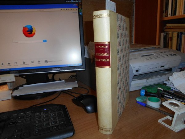 RAFFAELLO, UCCELLI. Firenze, Successore B. Seeber, 1922. Contributo alla Bibliografia della TOSCANA. In-8° grande, m. pergamena con larghe punte, fregi e titolo in oro al dorso, copertine originali conservate. xi, 466 pp. con testo due due colonne. Ottimo esemplare in bella legatura. Edizione di soli CCC esemplari numerati (n° 214). Uff. E - IV - 5 - 2