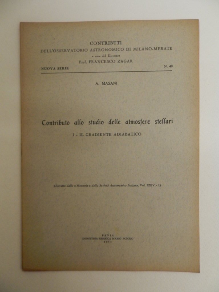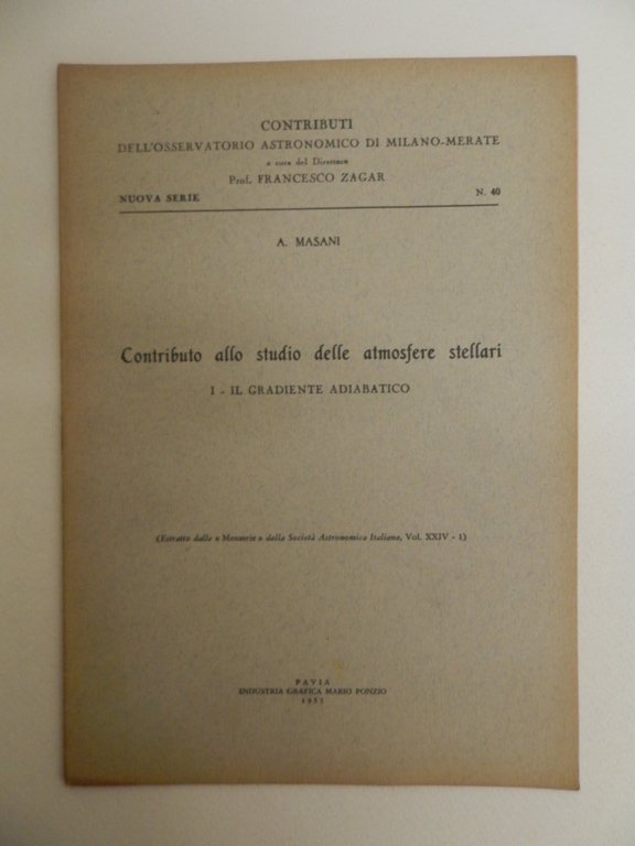 8^, pp. 18, brossura editoriale, titolo al piatto, 7 tabelle nel testo, estratto dalle memorie della Società Astronomica Italiana, Vol. XXIV-1. Esemplare molto buono. *** TUTTI I NOSTRI LIBRI SONO VISIBILI PREVIO CONTATTO MAIL O TELEFONO NELLA NUOVA SEDE DI MILANO: LIBRERIA COSMOPOLIS, VIA JOMMELLI, 22. ***