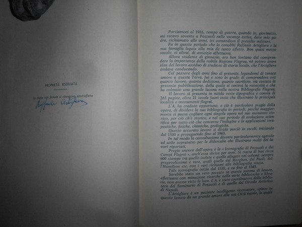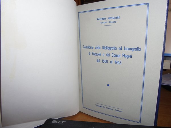 RAFFAELE, ARTIGLIERE. Pozzuoli, Tipografia G. d' Oriano, 1964. Contributo della Bibliografia ed Iconografia di Pozzuoli e dei Campi Flegrei dal 1500 al 1963. In-8°, tela bleu con titolo in oro entro tassello al dorso, copertine originali conservate. 276, (2) pp. con 21 tavole anche ripiegate fuori testo. Ottimo esemplare in legatura recente con le copertine originali conservate firmato dall' Autore al verso del frontespizio. Uff. E - IV - 5