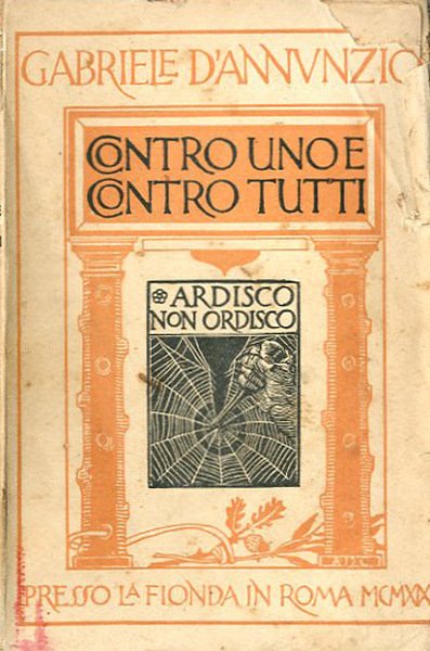 273 p. ; 19 x 13 cm. I discorsi patriottici e politici "romani" di D'Annunzio (data delle "avvertenze", Fiume d'Italia, 9 novembre 1919) raccolti poche settimane dopo l'inizio dell'«Impresa di Fiume» (12 settembre 1919). L’idea di conquistare Fiume per poi annetterla all’Italia iniziò a germinare nella testa di Gabriele D’Annunzio sul finire dell’ottobre 1918. Quando la disfatta dell’impero austroungarico era imminente e la fine della Prima guerra mondiale sempre più prossima, D’Annunzio, il «Vate» della letteratura italiana, colui che tanto pervicacemente si era battuto quattro anni prima per l’ingresso dell’Italia in guerra arringando le folle, iniziò a maledire l’imminente resa delle armi. “Sento fetor di pace”, disse prima ancora della battaglia di Vittorio Veneto che di fatto segnò il trionfo italiano e la consequenziale disfatta austriaca. In questa raccolta di testi «politici» di D'Annunzio vi sono tutte le premesse «ideali» e «interventiste» del «poeta guerriero». Brossura editoriale, coperta a colori illustrata da xilografia di De Carolis. Nel disegno motto: «Ardisco non ordisco». Segni del tempo alla coperta (macchie e ingiallimento, lacune all'angolo dx in alto della prima e all'angolo sx della quarta di copertina), al dorso (piccole mancanze) e ai profili (lacerazioni e tagli), pagine interne ingiallite. Firma di appartenenza nell'anteporta con data; 15 aprile 1920. Libro da collezione. Codice libreria 4993.