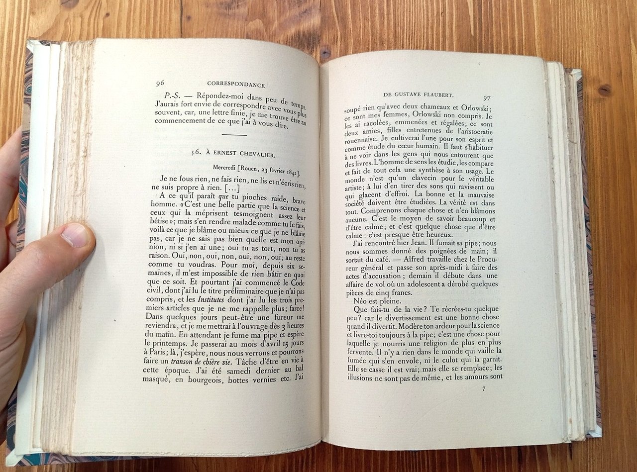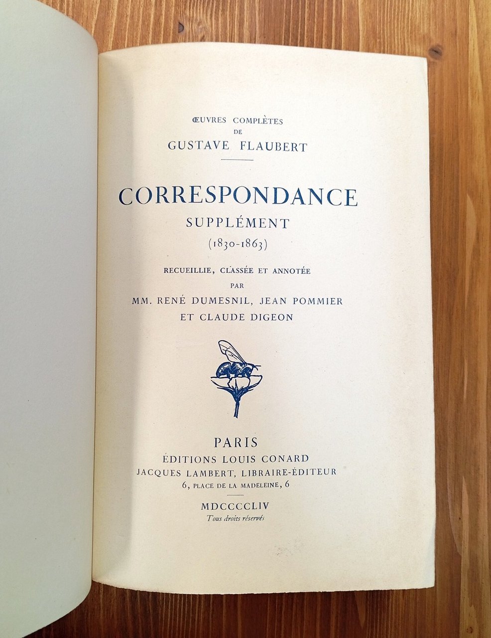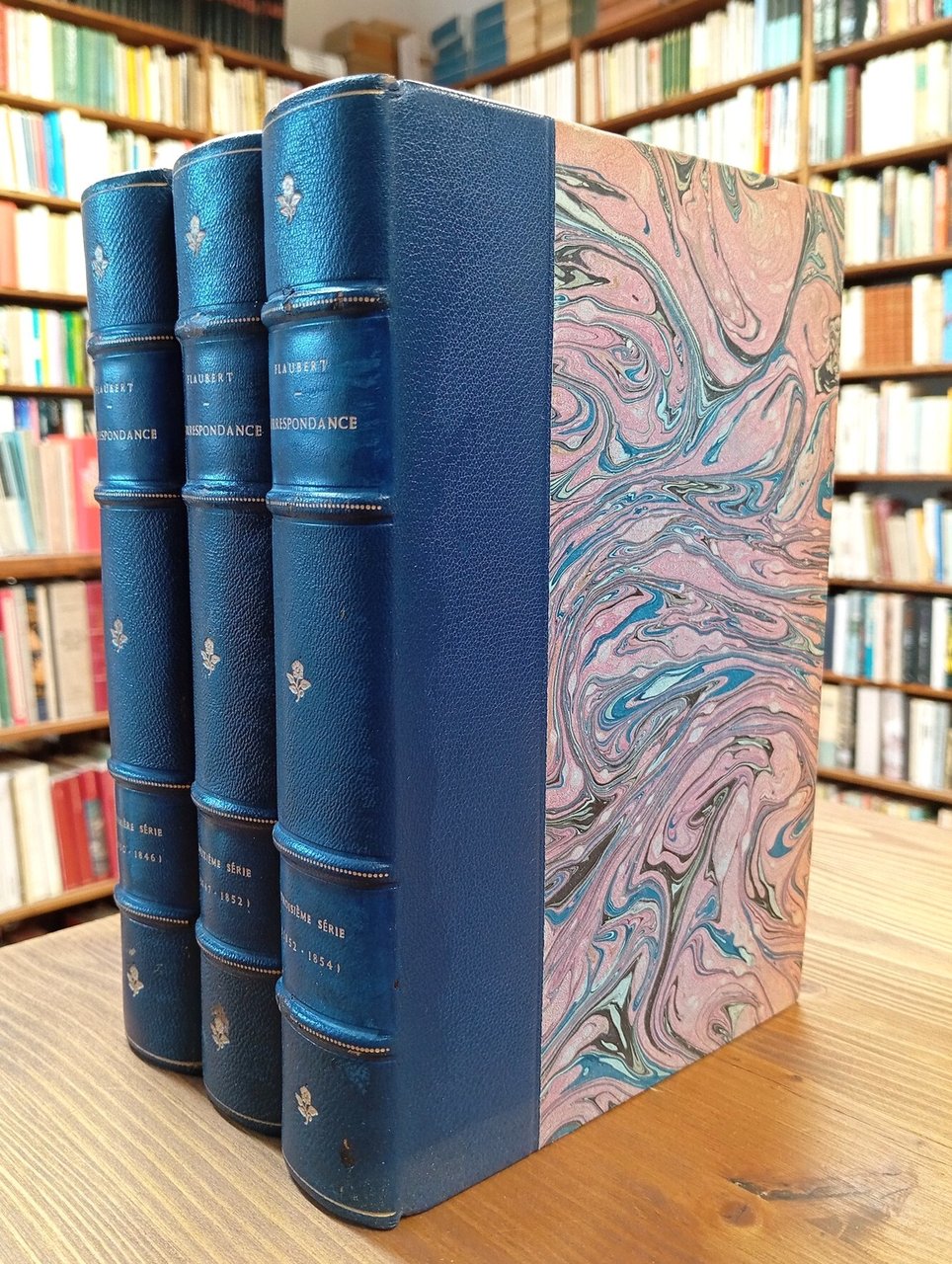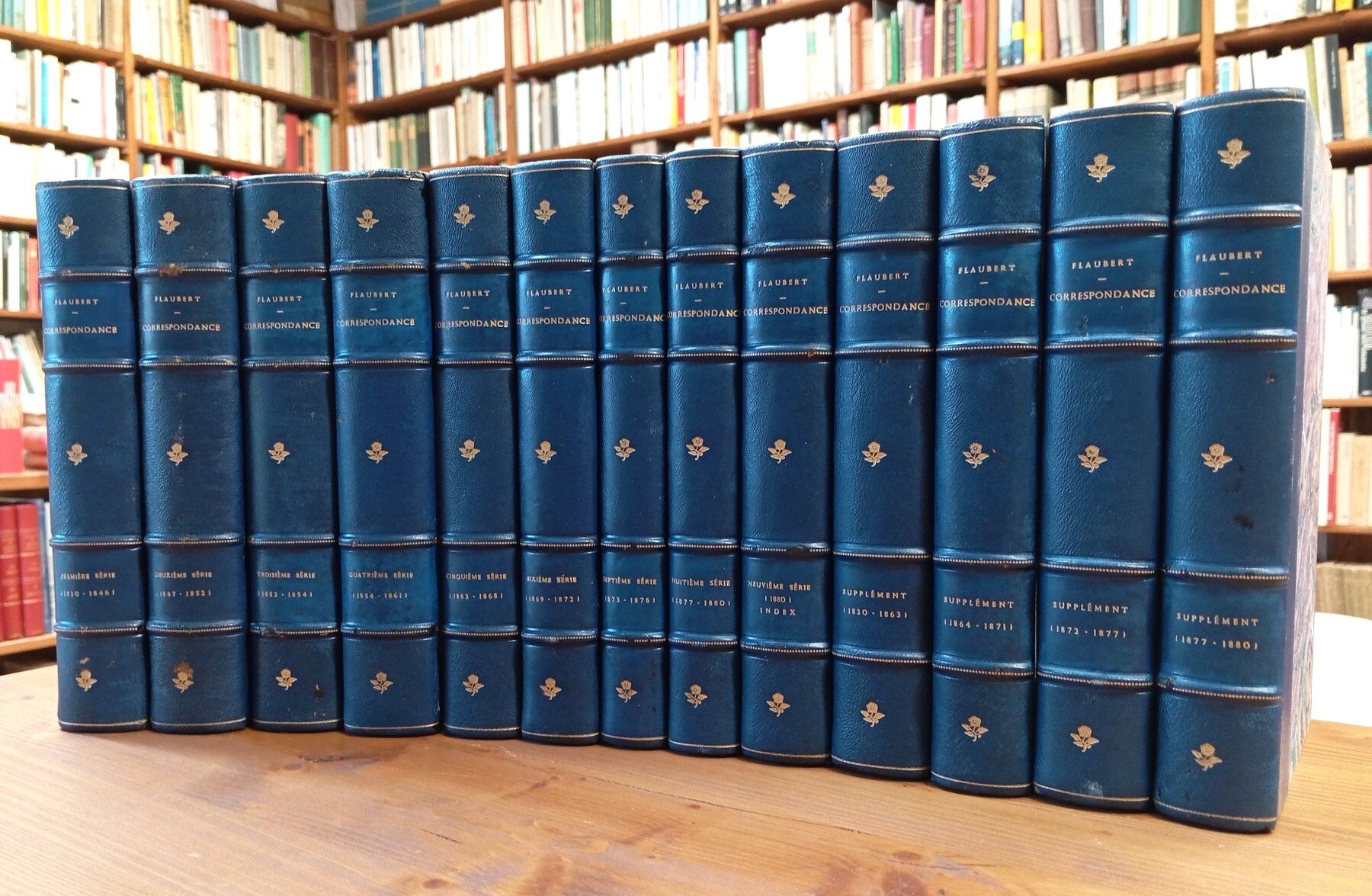 "Oeuvres complètes de Gustave Flaubert" - Raccolta completa, in lingua originale, degli epistolari di Flaubert, dalla Prima alla Nona serie, cui si aggiungono altri quattro volumi di supplementi pubblicati nel 1954, raccolti classificati e annotati da René Dumesnil, Jean Pommier e Claude Digeon. Ogni singolo tomo è rilegato in uniforme, elegante mezza pelle blu con titoli e fregi in oro al dorso, piatti e sguardie marmorizzati, nastrini segnapagine in seta blu; ciascun volume conserva al suo interno la copertina della brossura originale. La pelle di alcuni dorsi riporta qualche lieve abrasione, peraltro l'intera opera risulta in eccellente stato di conservazione, poco o nulla frequentata (alcune parti sono ancora intonse, ossia a fogli chiusi); lotto da collezione. Contattare la libreria per ulteriori informazioni. Segue il dettaglio dei volumi: VOL. I: Première série (1830-1846), 1926, xlv-440 pp. - VOL. II: Deuxième série (1847-1852), 1926, 485 pp. - VOL. III: Troisième série (1852-1854), 1927, 448 pp. - VOL. IV: Quatrième série (1854-1861), 1927, 472 pp. - VOL. V: Cinquième série (1862-1868), 1929, 437 pp. - VOL. VI: Sixième série (1869-1872), 1930, 498 pp. - VOL. VII: Septième série (1873-1876), 1930, 396 pp. - VOL. VIII: Huitième série (1877-1880), 1930, 417 pp. - VOL. IX: Neuvième série (1880); Index analytique, 1933, 466 pp. - VOL. X: Supplément (1830-1863), 1954, xii-343 pp. - VOL. XI: Supplément (1864-1871), 1954, 319 pp. - VOL. XII: Supplément (1872 - juin 1877), 1954, 365 pp. - VOL. XIII: Supplément (juillet 1877 - mai 1880), 1954, 362 pp.