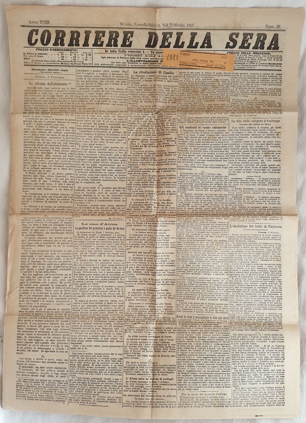 CORRIERE DELLA SERA MILANO DOMENICA LUNEDI 8-9 FEBBRAIO 1897