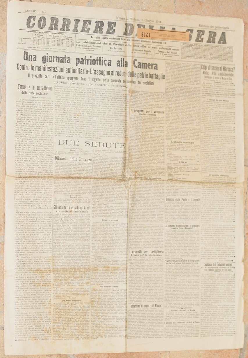 In folio. Dim. 59,5x43,5 cm. Pp. 8. Numero del 3 giugno 1911 di questo storico quotidiano italiano fondato a Milano nel 1876. Tra gli argomenti trattati: Una giornata patriottica alla Camera, Mulai Afid abdica in Marocco, L'organizzazione del raid Parigi Roma Torino, Salme dei generali di Crimea, Il monumento a Vittorio Emanuele sul Campidoglio, Frey ripartirà stamane da Pisa per Roma, Processo di Viterbo, Sport: Il duello Galetti Petit Breton sulle aspre strade pugliesi, La questione delle frodi sui Trams ecc. Belle pubblicità. In buone condizioni. Raro. Brossura editoriale in buone condizioni generali con lievi usure ai margini e dorso. Piegature. All'interno le pagine si presentano in buone condizioni con rare fioriture. Piegature ed usure marginali. Number of the 3rd of June 1911 of this historical daily magazine established in Milan in 1876. Between the issues treated: A patriotic day in Camera, Mulai Afid in Morocco, Organization of raid Parigi Roma Torino, Dead bodies of generals of Crimea, The monument to Vittorio Emanuele on Campidoglio, Frey will leave tomorrow from Pisa to Rome, Trial of Viterbo, Sport: Galetti Petit Breton on the difficult streets in Puglia, Frauds in Trams etc. Beautiful advertisings inside. In good conditions. Scarce copy. Editorial cover in good general conditions slightly worn in the edges and spine. Foldings and wearings. Inside pages are in good conditions with occasional foxings. Foldings.