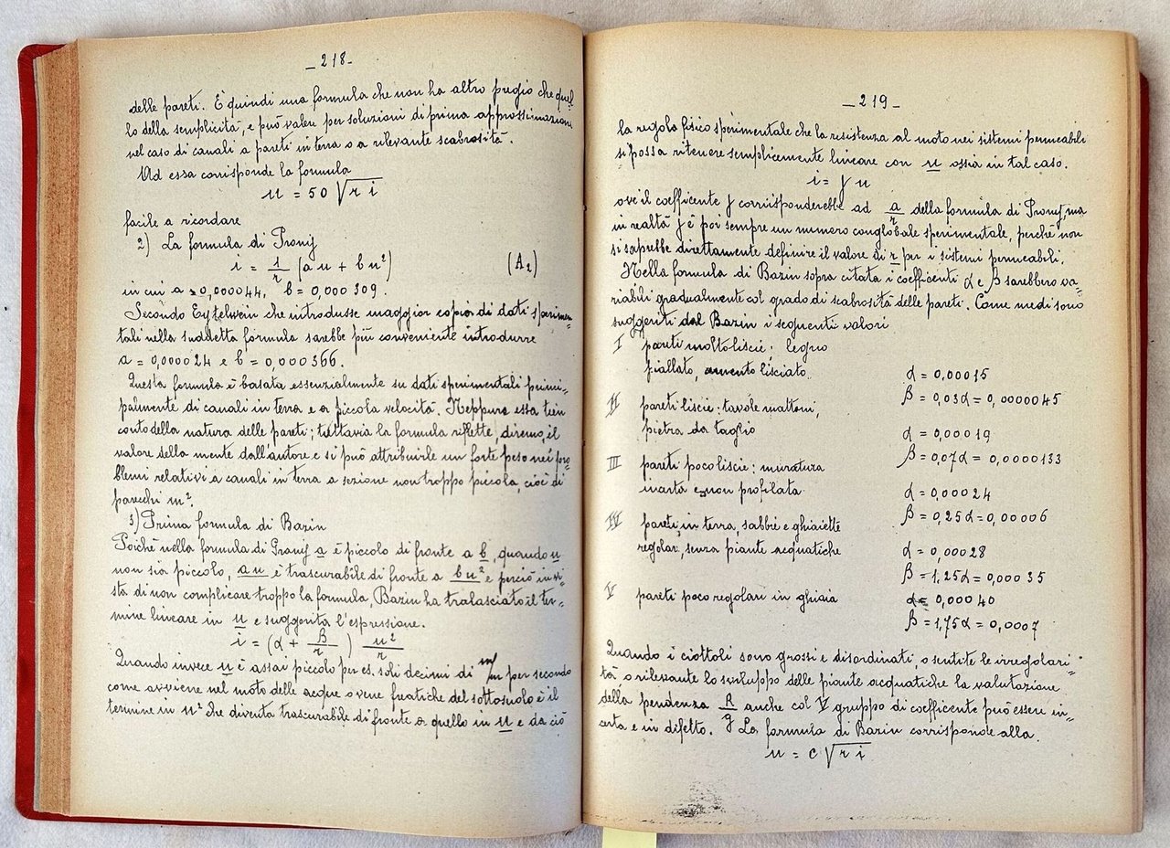 Rara raccolta di appunti delle lezioni di Idraulica e costruzioni idrauliche (condotta delle acque) del Prof. Ettore Paladini (1848-1930) dettate nel Regio Istituto Tecnico Superiore di Milano durante il corso di aprile-luglio 1920 Paladini occupò il posto di professore di Idraulica al Politecnico dal 1900 al 1923. Fu membro dell'Istituto Reale Lombardo, fu attivo nei lavori pubblici e fece numerosi progetti per utilizzare l'acqua del Po per l'irrigazione e come via di comunicazione. Il Canale Villoresi, da lui stesso creato, collegava le province piemontesi con quelli lombarde. Gli appunti sono stati redatti in copia manoscritta. Tagli marmorizzati. In ottime condizioni. Copertina in tela con titolo in oro al dorso e puiatto anteriore in buone condizioni Legatura in buone condizioni. Pagine in ottime condizioni con rare fioriture. Rinforzo ai margini di pag. 260 e 261 con leggera perdita di testo. In 4. Dim. 27,5x19,5 mm. Pp. 355+(1)+536Scarce collection of notes of the lessons of hydraulics and hydraulic constructions (waters) by the Prof. Ettore Paladini (1848-1930) told in the Regio Istituto Tecnico Superiore di Milano during the course of april-july 1920 The notes are written in manuscripted copy In very good conditions. Cloth cover with gilted title in the spine and front plate in good conditions. Binding in good conditions. Pages in very good conditions with occasional foxing. Reinforcement in the extremities of pag. 260 and 261 with light loss of text. In 4. Dim. 27,5x19,5 mm. Pp. 355+(1)+536