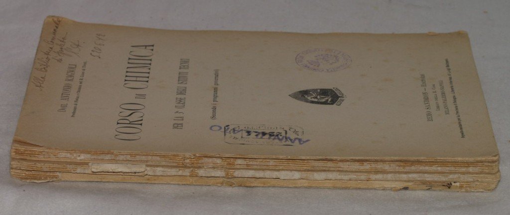 In 8. Dim. 23x15 cm. Pp. 268. Senza data ma dei primissimi anni del 1900. All'interno la descrizione delle sostanze chimiche e le basi della chimica. 89 figure in bianco e nero illustrano il testo. Presente dedica autografata dell'autore stesso. Copertina assente, presente solo piatto posteriore. Legatura quasi assente. All'interno le pagine si presentano in ottime condizioni con rare fioriture. Not dated but of the very first years of 1900. Inside the description of the chemical substances and the rules of chemistry. 89 white and black figures illustrate the text. There is the dedication with signature of the author. Cover is missing, there is only the back plate. Binding almost absent. Inside pages are in very good conditions with occasional foxings.