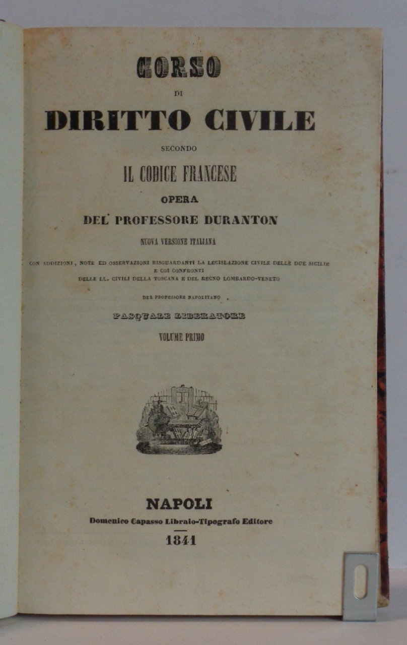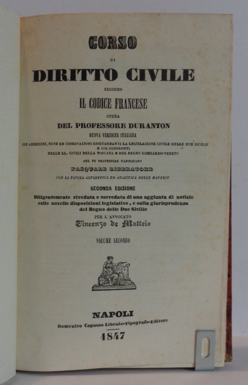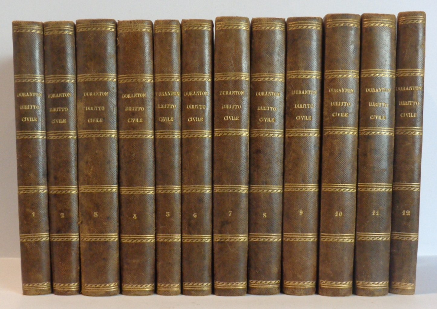 ".opera del professore Duranton. Nuova versione italiana con addizioni, note ed osservazioni riguardanti la legislazione civile delle due Sicilie e coi confronti delle ll. civili della Toscana e del regno Lombardo-Veneto del professore napolitano Pasquale Liberatore". 12 volumi (26x18 cm.), rilegatura in mezza pelle con finte nervature, titolo e numero del volume dorati al dorso; piatti con carta marmorizzata. Lievi usure ai piatti delle legature, sporadiche fioriture, nel complesso ottime condizioni. L'opera è completa nei 12 volumi, che però appartengono a edizioni differenti; in particolare i volumi 2, 3, 4, 5, 7, 8, 9 e 10 sono seconde edizioni e al frontespizio è aggiunta la seguente dicitura: "Seconda edizione diligentemente riveduta corredata di una aggiunta di notizie sulle novelle disposizioni legislative, e sulla giurisprudenza del Regno delle Due Sicilie per l'avvocato Vincenzo de Matteis". Vol. 1 (1841): 363 pagine. Vol. 2 (1847, seconda edizione): 352 pagine, una piccola mancanza alla pagina 351-352 senza perdita di testo. Vol. 3 (1847, seconda edizione): 448 pagine. Vol. 4 (1847, seconda edizione): 416 pagine. Vol. 5 (1847, seconda edizione): 264 pagine. Vol. 6 (1842): 330 pagine. Vol. 7 (1848, seconda edizione): 420 pagine. Vol. 8 (1849, seconda edizione): 390 pagine. Vol. 9 (1850, seconda edizione): 386 pagine. Vol. 10 (1850, seconda edizione): 372 pagine. Vol. 11 (1845): 420 pagine. Vol 12 (1850): 274 (tavola alfabetica e analitica) + 42 (trattato dell'enfiteusi) pagine.