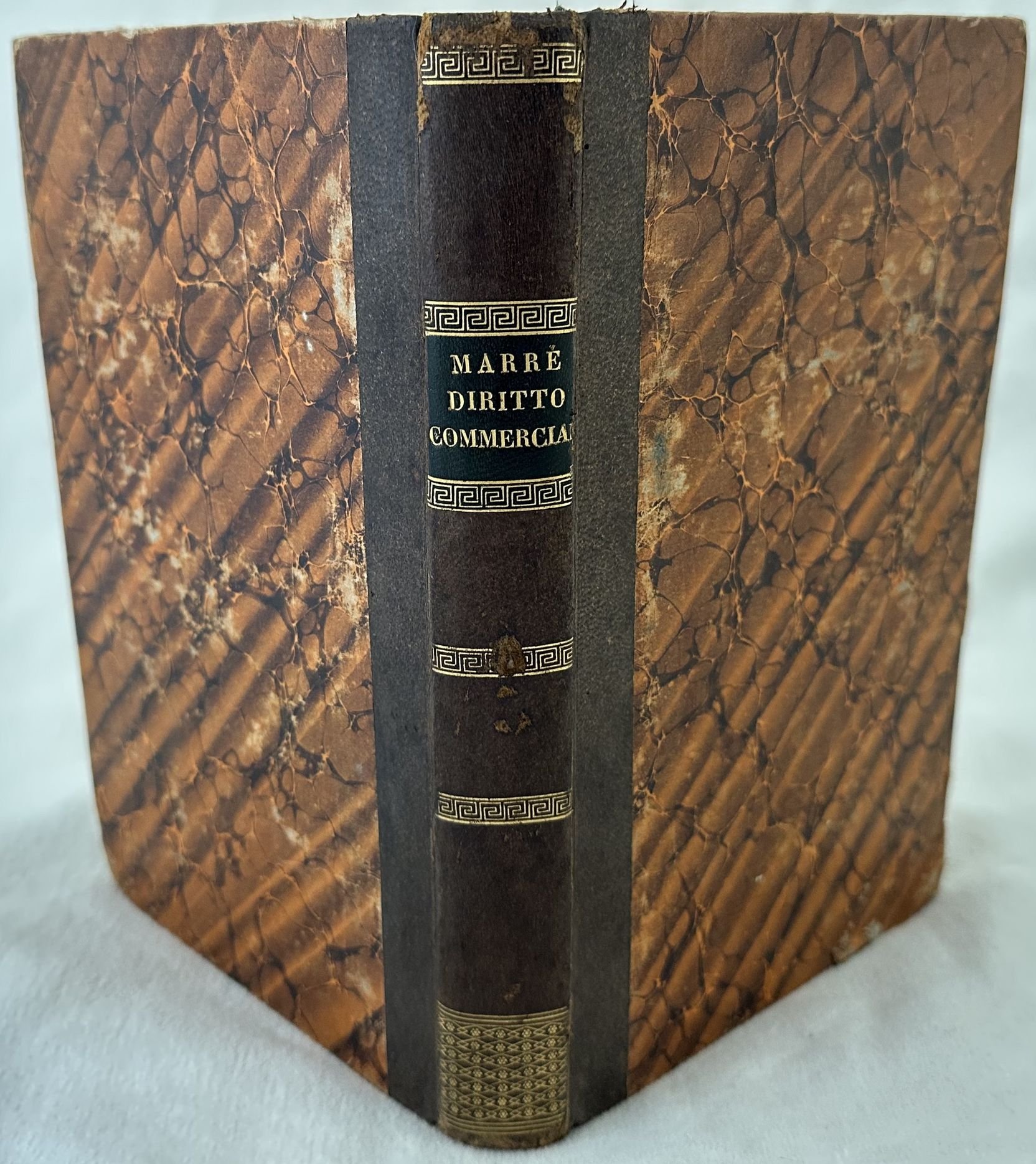 Edizione del 1840 di questo manuale di diritto commerciale scritto dall'Avvocato Gaetano Marrè professore di diritto commerciale nella Regia Università di Genova. All'interno: Commercio in generale, Libri di commercio, Società di commercio, separazione dei beni, lettere di cambio, Del diritto commerciale marittimo, Dei fallimenti, Giurisdizione commerciale ecc. In ottime condizioni. Copertina in mezza pelle con titolo in oro su tassello al dorso in buone condizioni con usure. Legatura in buone condizioni. Pagine in buone condizioni generali con fioriture. In 8. Dim. 23,5x15 cm. Pp. 374.Edition of 1840 of this manual of trade right written by the lawyer Gaetano Marrè teacher of commercial right in the Regia Università di Genova. inside: Commercio in generale, Libri di commercio, Società di commercio, separazione dei beni, letetre di cambio, Del diritto commerciale marittimo, Dei fallimenti, Giurisdizione commerciale ecc. In very good conditions. Half leather cover with gilted title in the spine in good conditions lightly worn in the extremities. Binding in good general conditions. Inside pages are in good conditions with foxing. In 8. Dim. 23,5x15 cm. Pp. 374.<BR>