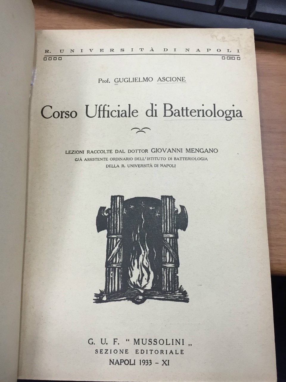 Lezioni raccolte dal dottor Giovanni Mengano. Napoli. G.U.F. Mussolini 1933, 8°, pp. 400, con illustrazioni in nero e a col. Leg. T.t. coeva, tit. in oro con bruniture e semistaccato dal testo., sciupata.