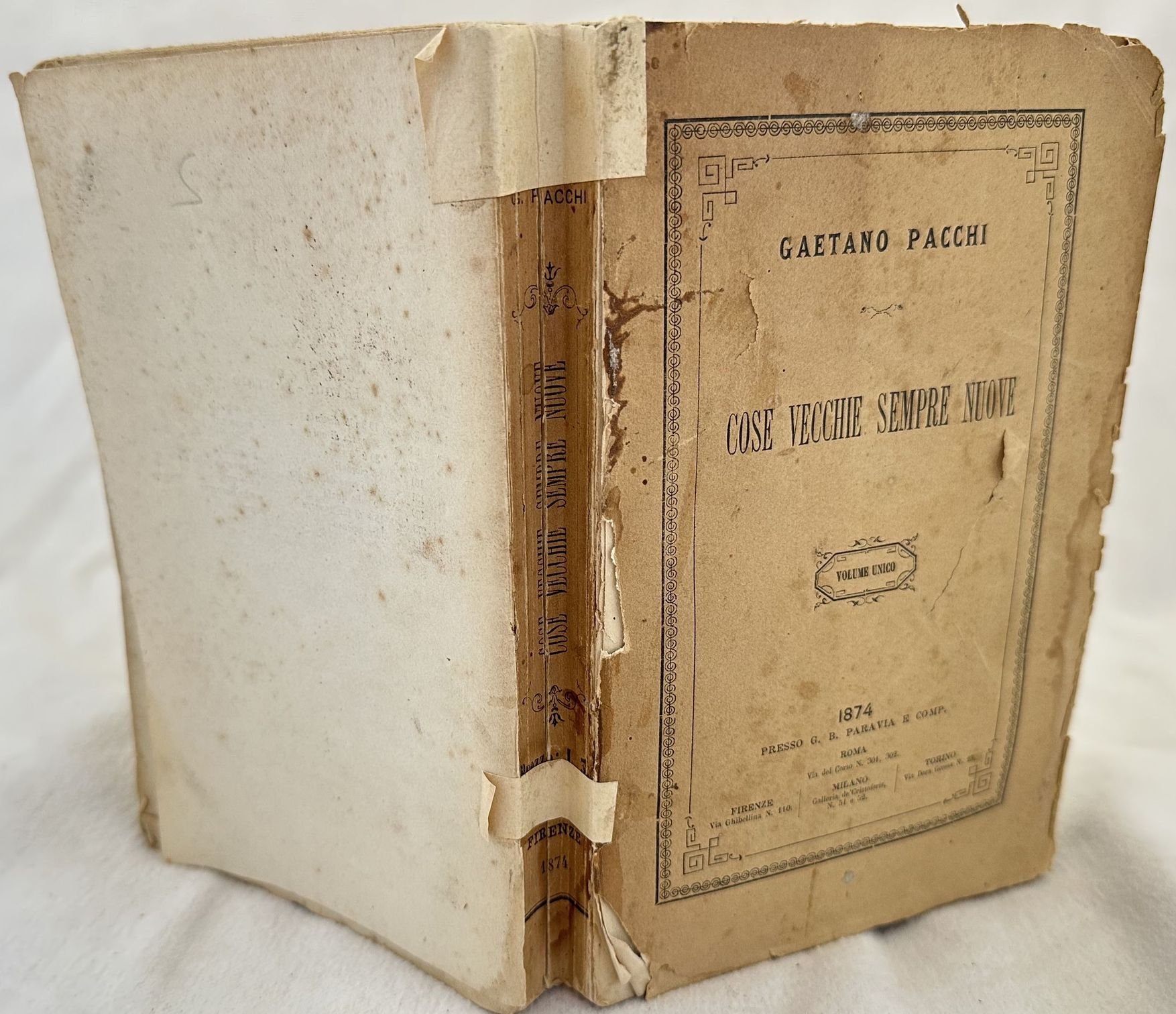 Edizione del 1874 di questa opera storica scritta da Gaetano Pacchi. Dallindice: L'Italia dalla caduta di Napoleone all'occupazione di Roma; Monarchia costituzionale; Una rivista di popoli (Sparta, Roma, Prussia, Francia, Spagna); Banco del lotto; Qualità delloperaio (integrità, puntualità, assiduità al lavoro). In discrete condizioni. Copertina editoriale in discrete condizioni con usure marginali. Piatto posteriore mancante. Legatura in discrete condizioni con lievi rotture. All'interno le pagine si presentano in buone condizioni con rare fioriture. In 16. Dim. 18,5x12 cm. Pp. V+452+(1).Edition of 1874 of this hystorical work written by Gaetano Pacchi. In fair conditions. Editorial cover in fair conditions lightly wormn in the extremities. Back plate lacks. Binding in fair conditions with light cracks. Pages in good conditions with occasional foxing. In 16. Dim. 18,5x12 cm. Pp. V+452+(1).
