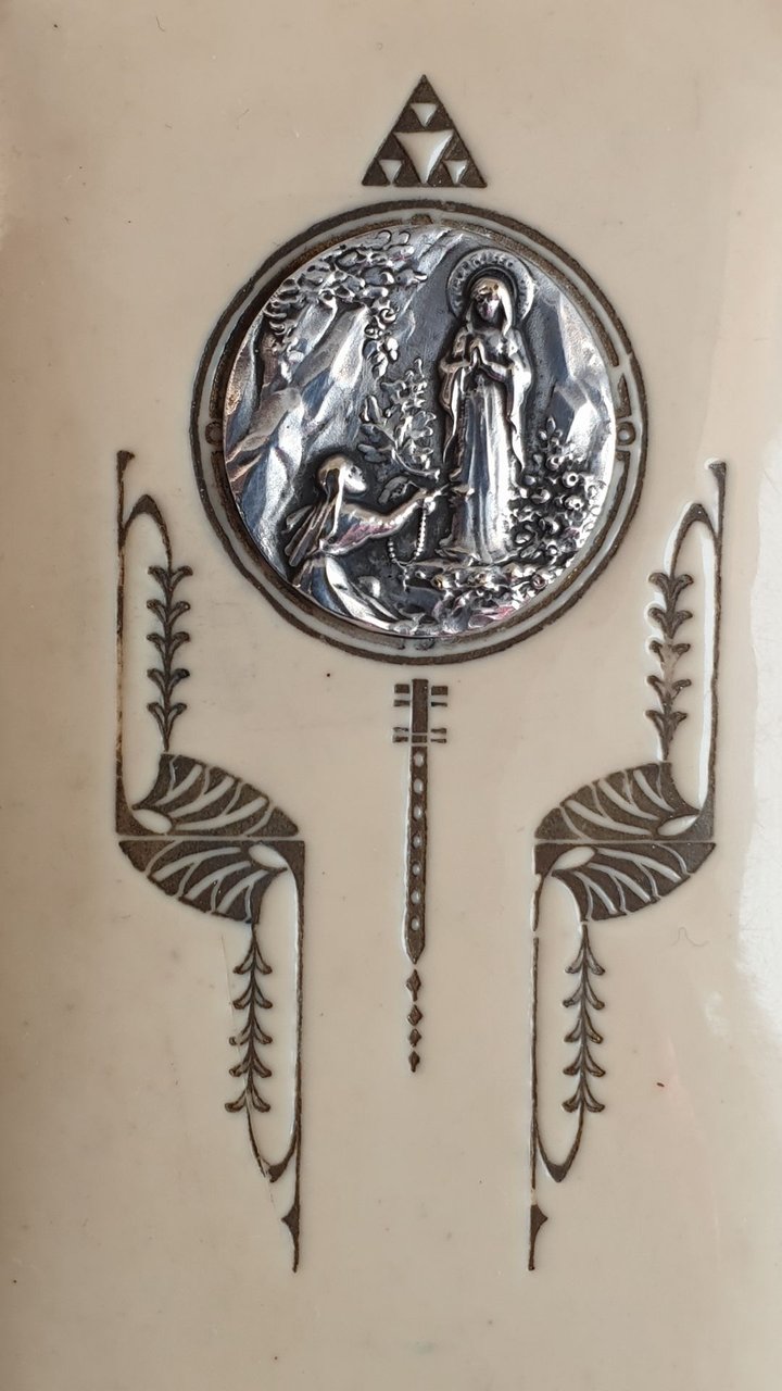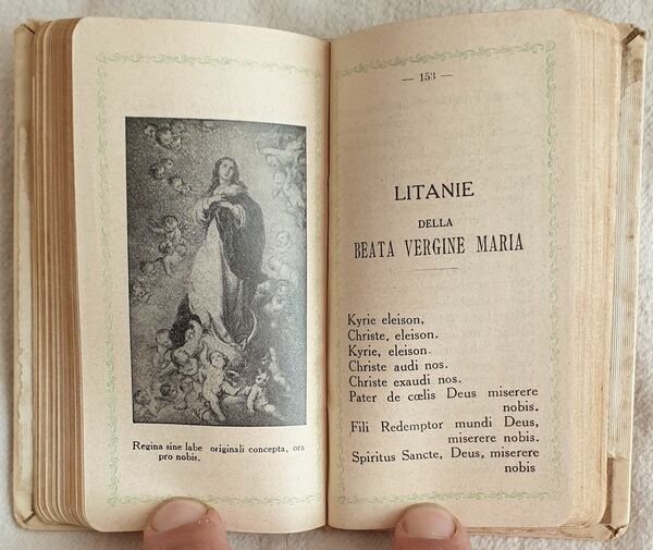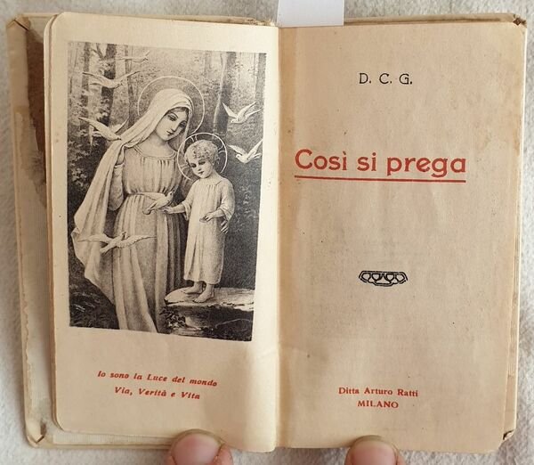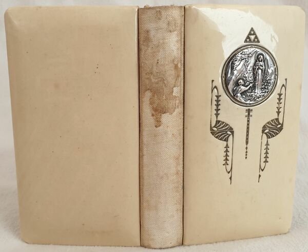 Bellissimo manualetto di preghiere del 1923. Splendida copertina in cellulosa in pieno stile liberty con bellissima placchetta (cm 2,5x2,5) in argento 800 finemente cesellato che rappresenta la Vergine del Rosario. Decorazioni in stile liberty. Testo entro cornice floreale stile liberty. Qualche illustrazione a piena pagina all'interno. Contiene una serie di preghiere, preparazione alla comunione, Messa, Orazione a M. V. Addolorata, Via Crucis, Meditazioni, Rosario, Litanie, Inni e cantici vari, Inno a S. Luigi Gonzaga, Novena del Natale, inni popolari: Al S. Cuore di Gesu, Loe a Maria, A Maria consolatrice, L'immacolata di Lourdes, Andro a vederla un di, Mira il tuo popolo. Qualche illlustrazione all'interno. Bellissimo e prezioso volume. In ottime condizioni. Copertina in cellulosa e placchette in argento cesellato in ottime condizioni generali con lievi usure ai margini e dorso. Legatura in buone condizioni. All'interno le pagine si presentano in ottime condizioni con rare fioriture. In 24. Dim. 11,5x6,5 cm. Pp. 241+(3). Very beautiful little manual of prayers of 1923. Very beautiful cellulose cover in liberrty style with very beautiful chased silver plate (cm 2,5x2,5) representing Virgin of Rosary. Decorations in liberty style. It contains a series of prayers, preparation to communion, Mass, Oration to M. V. Addolorata, Via Crucis, Meditations, Rosario, Litanies Hymn: Al S. Cuore di Gesu, Loe a Maria, A Maria consolatrice, L'immacolata di Lourdes, Andro a vederla un di, Mira il tuo popolo, Christmas. Some illustration inside. Very beautiful and precious volume. In very good conditions. Cellulose cover with silver plate in very good general conditions. Binding in good conditions. Inside pages are in very good conditions with occasional foxings. In 24. Dim. 11,5x6,5 cm. Pp. 241+(3).