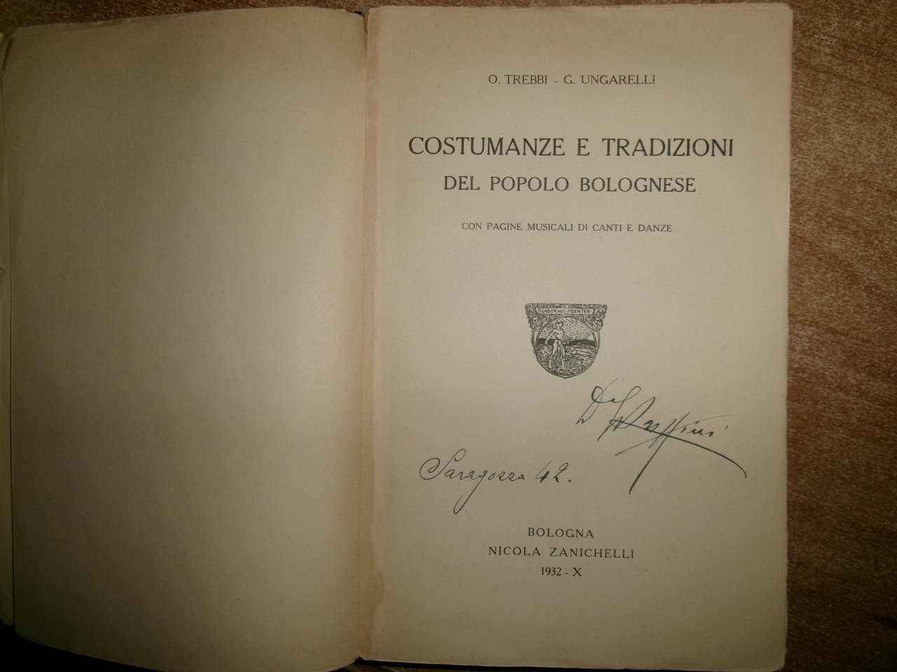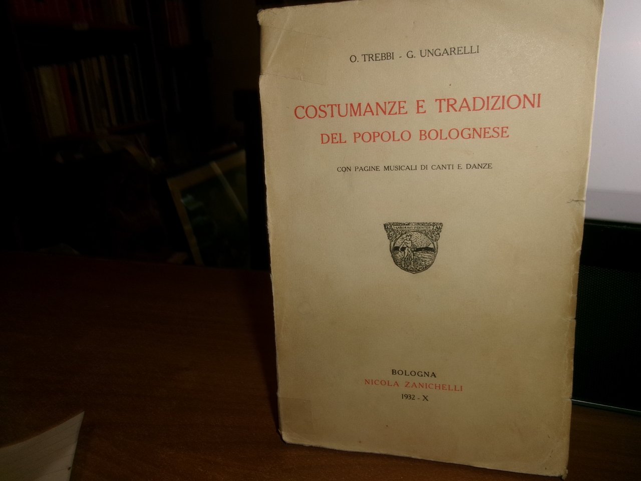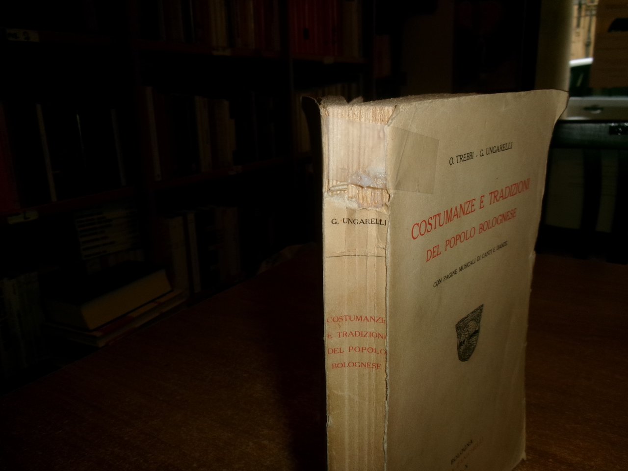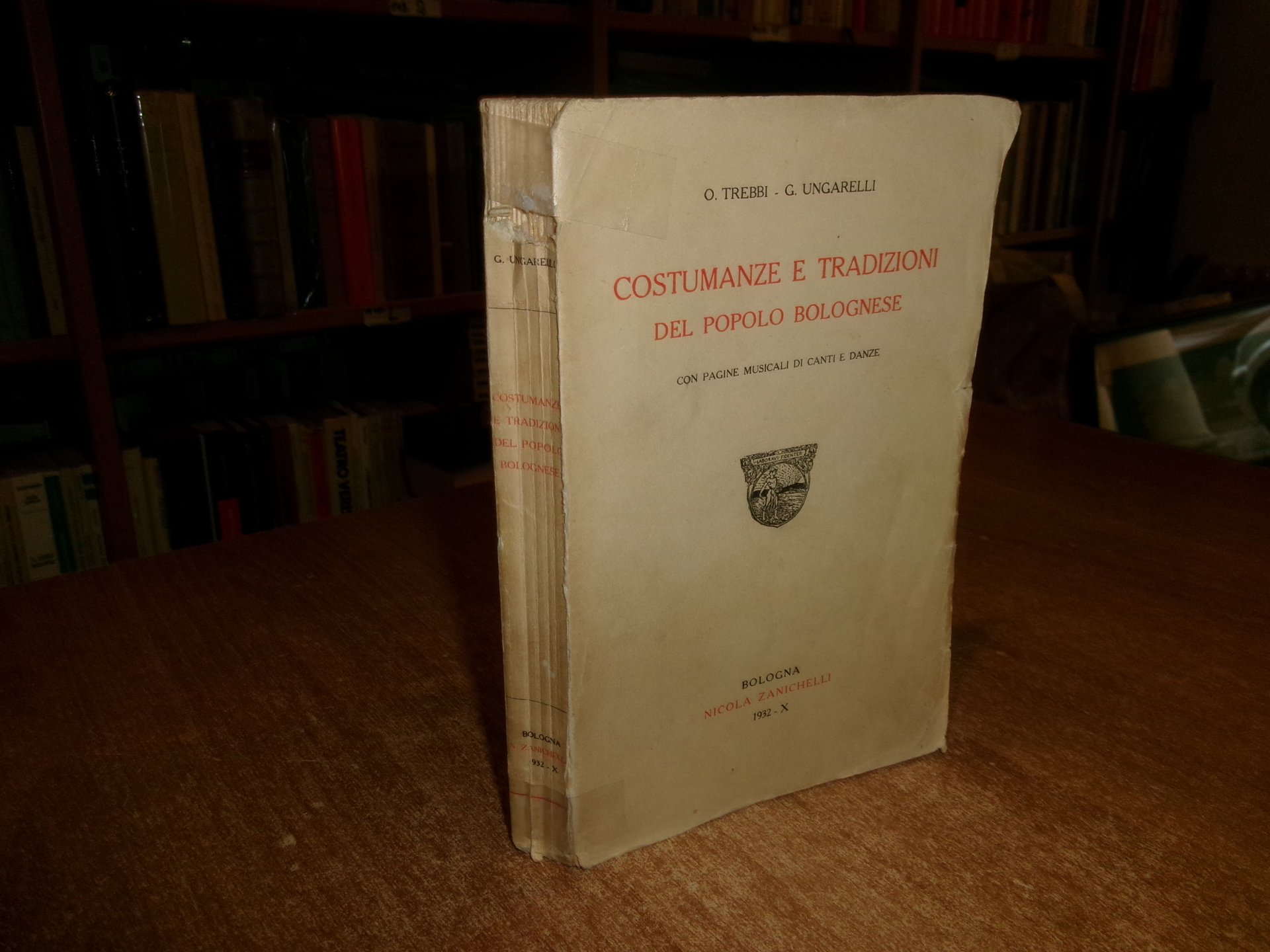 O. TREBBI - G. UNGARELLI. Bologna, Zanichelli, 1932. Costumanze e tradizioni del popolo bolognese. Con pagine musicali di canti e danze. In-8°, br. orig. 256 pp. + 20 con spartiti musicali f.t. In buono stato di conservazione a causa del dorso con piccola mancanza in alto. Firma di ex proprietà al frontespizio. Interno ottimo. Interno ottimo. Neg. Bol. mob. B entro busta trasp.